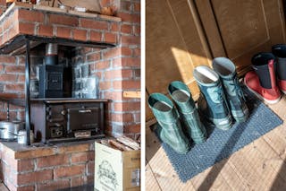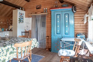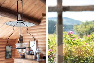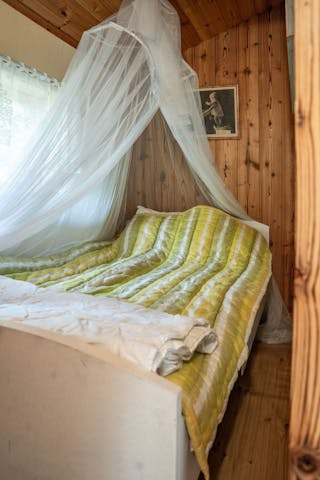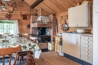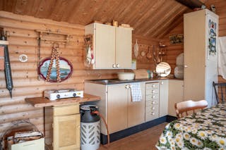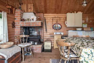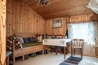 Stugan är enkel men charmig, med vedspis för värme, fotogenlampor för kvällsljus och plats för det viktigaste. Utsikten från verandan är något alldeles extra – öppet vatten åt flera håll, tystnaden som bara en udde kan erbjuda och solnedgångar du sent kommer glömma.