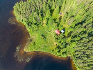 Tomten är generös och privat, med vacker utsikt, skog som omfamnar hela platsen. Här finns gott om plats för både stillhet och rörelse, paddla, fiska, plocka bär eller bara låt tiden gå.