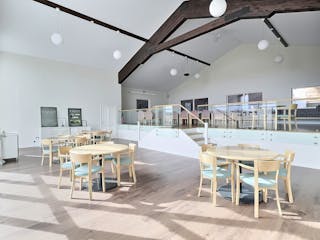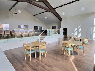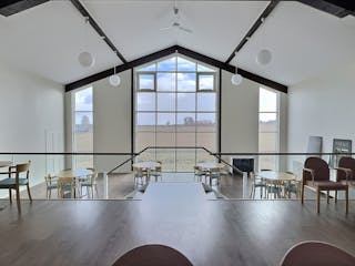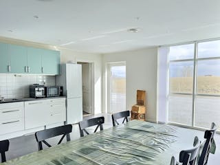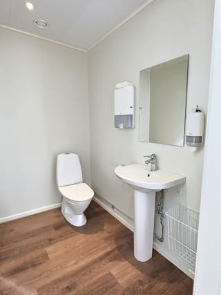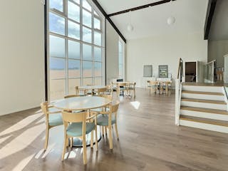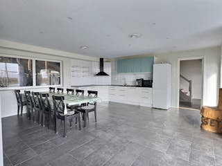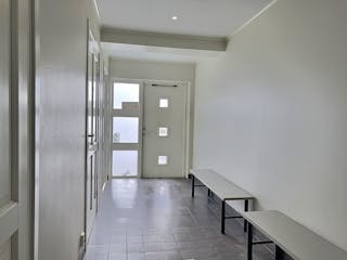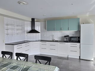 I anslutning till personalutrymmena finns det ett stort kök med flera sittplatser, toalett och en mindre hall med en egen ingång.