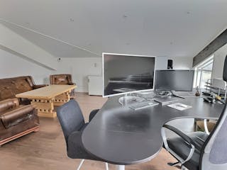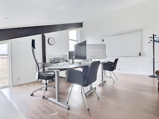 Det finns en ytterligare egen ingång utifrån med en hall och en trappa upp till övervåningen. På övervåningen finns det ett stort och ljust kontor direkt till höger efter trappan. Här är det plats för skrivbord, förvaring och en sittgrupp.