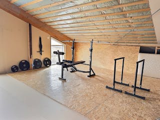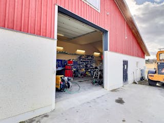 Fullt utrustad verkstad med bl.a. svets, verktyg, kompressor m.m. Verkstaden har en egen ingång samt en takskjutport med höjd om 4 meter. Ingång in till verkstaden finns även från stallet via två olika portar. Verkstaden har gipsade väggar, gjuten betongplatta med golvvärme och oljeavskiljare. Lysrör finns på bägge väggarna nära taket, Här finns även trådlöst internet. Förvaringsutrymme med port utvändigt finns ovanför verkstadens takskjutport.