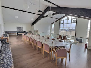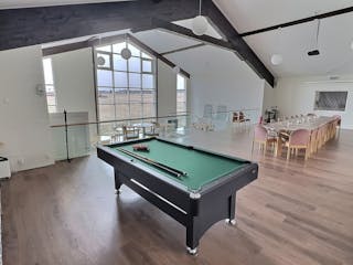 Till vänster finns det en stor sällskapsyta i två olika plan som har ett ljusinsläpp via en hög glasvägg med utsikt över omgivningen. Här finns det flera sittplatser, biljardbord, förvaringsskåp, toalett och ett rum som är förberett att användas som en SPA-avdelning. Denna är ej helt färdigställd men har ventilation, brandskydd, kraftiga balkar för att klara vikten av en pool och är förberett med erforderligt avlopp. Det finns inget bygglov ansökt för SPA och konferensanläggning.