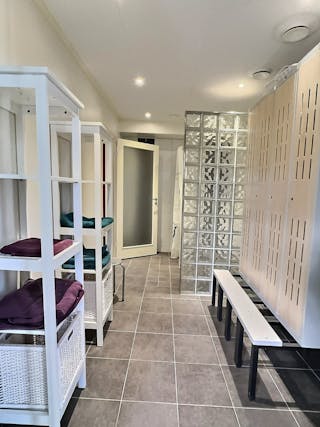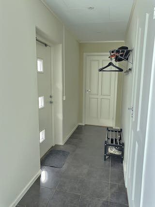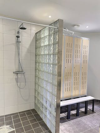 Personalen har en egen ingång utifrån utan att behöva passera genom djurstallarna Vid entrén möts man av en rymlig hall , via en dörr i hallen kommer man vidare in i omklädningsrummet där det finns klädskåp med en sittbänk, toalett samt duschmöjligheter. Det finns även hyllor med plats för handdukar, förvaring m.m. Eget utrymme med skåp för arbetskläder, tvättmaskin, torktumlare och mindre diskbänk med en egen utgång via hallen till djurstallet.