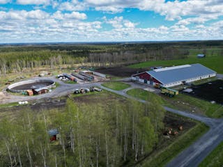 Effektiv biogasanläggning som är i drift och rötar gödsel från gödselbrunnen via pumpbrunnar. Värmeväxlare är monterade för att hålla rätt temperatur i rötningskammaren.