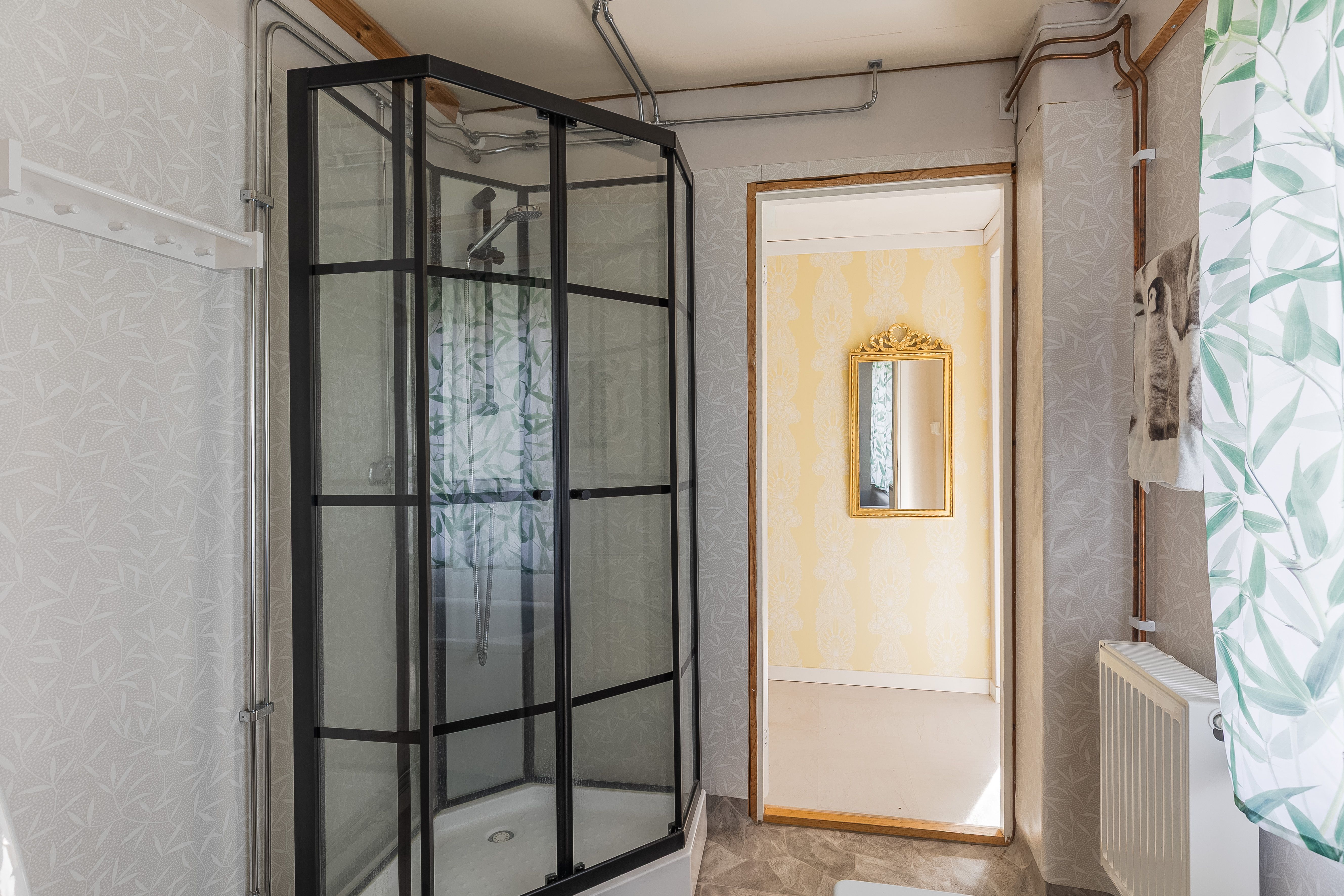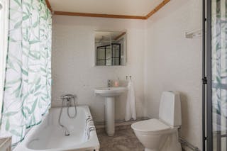Badrum renoverat i modern tid med wc, duschkabin, badkar, handfat, våtrumstapet och våtrumsmatta.