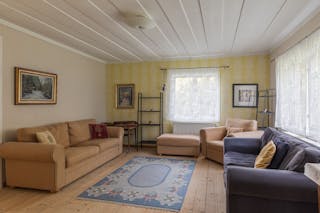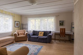 Vardagsrum med vackert trägolv, fönster i två riktningar, målad vägg samt tapet och ackumulatortanken till det vattenburna systemet som är väl dold bakom en snillrik lösning.