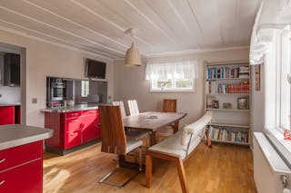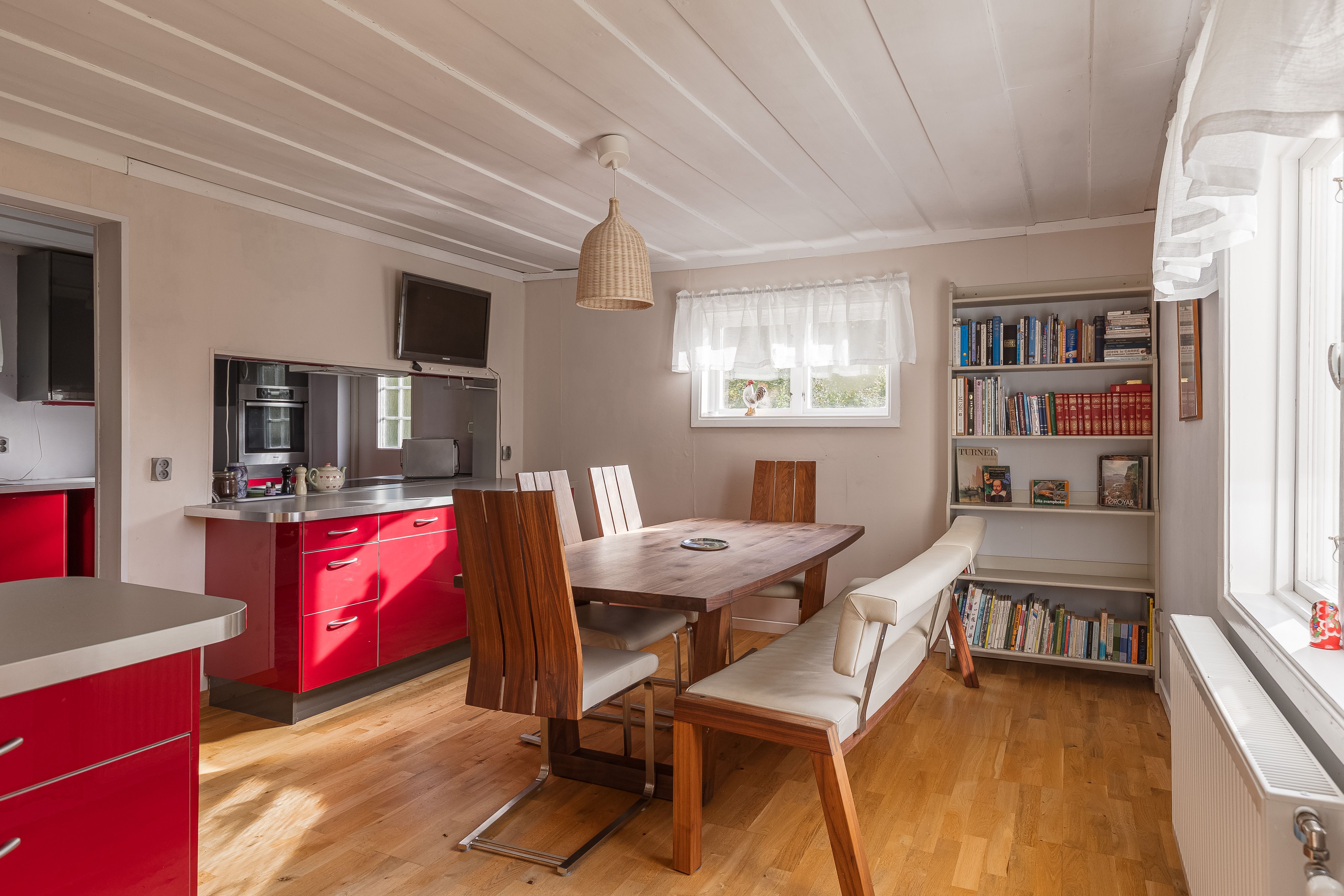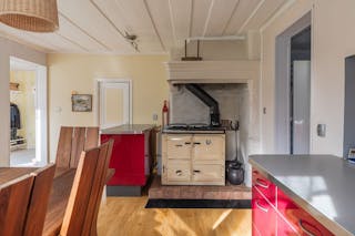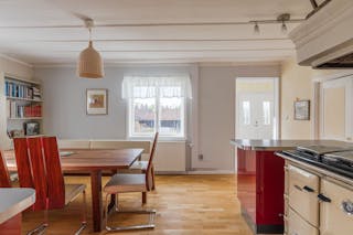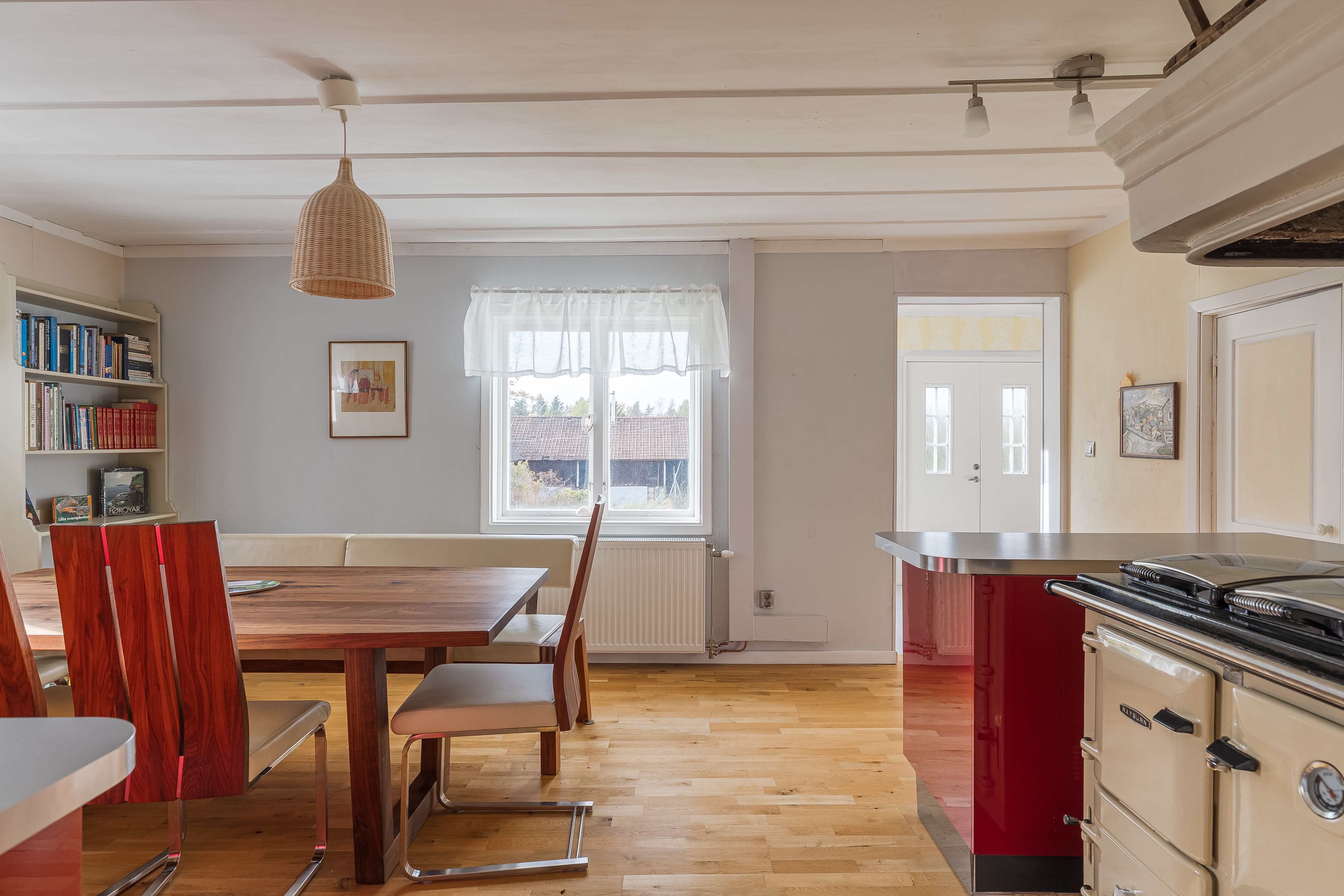 Renoverat kök och matplats med ekparkett och plastmatta, målade väggar vacker spis från Rayburn som även fungerar som värmekälla, kyl och frys från Bosch, stor induktionshäll från Electrolux och ugn och diskmaskin från Miele.