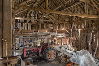 Stor ladugård med mycket förvaringsutrymmen, utrymmen med minnen från svunna tider när djur fanns på gården samt en maskinhall i byggnadens vinkel med uppgång till skullen. I vinkeln är stommen helt av trä medan den vid ladugården delvis är gjuten (eller murad). Fasaden är klädd med träpanel och på taket ligger tegelpannor. Stora delar av byggnadens stomme har klarat sig fint. Några delar av framförallt mellanbjälklaget har dock mörknat p.g.a. några läckor i taket. Taket behöver nödvändigtvis inte läggas om helt men för att säkra byggnadens framtid behöver några läckor tätas och murkna delar av framförallt mellanbjälklaget bytas ut.