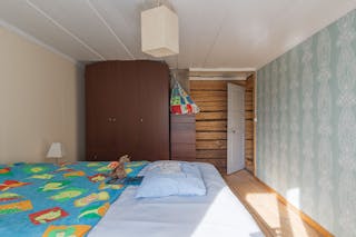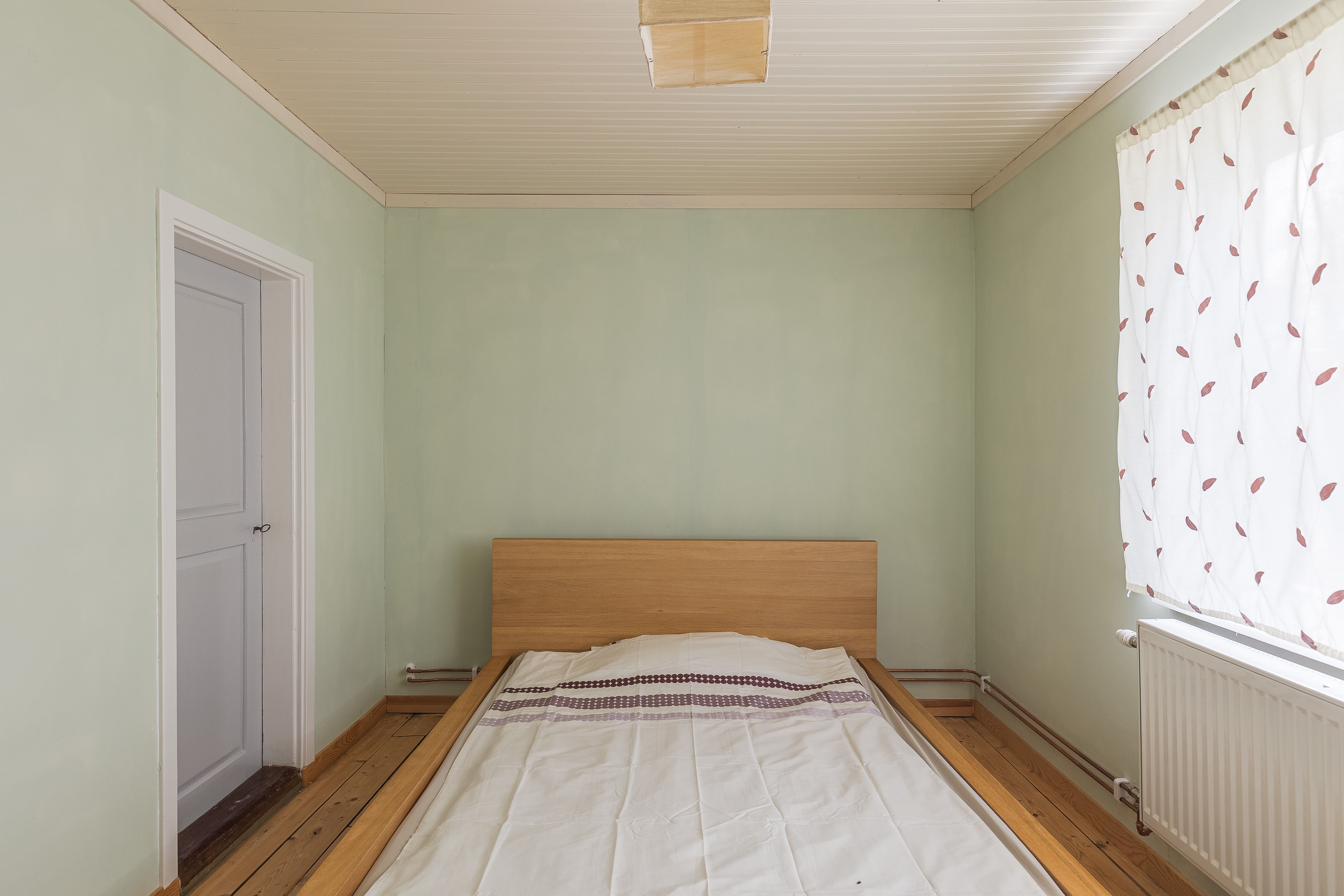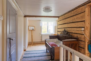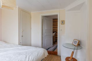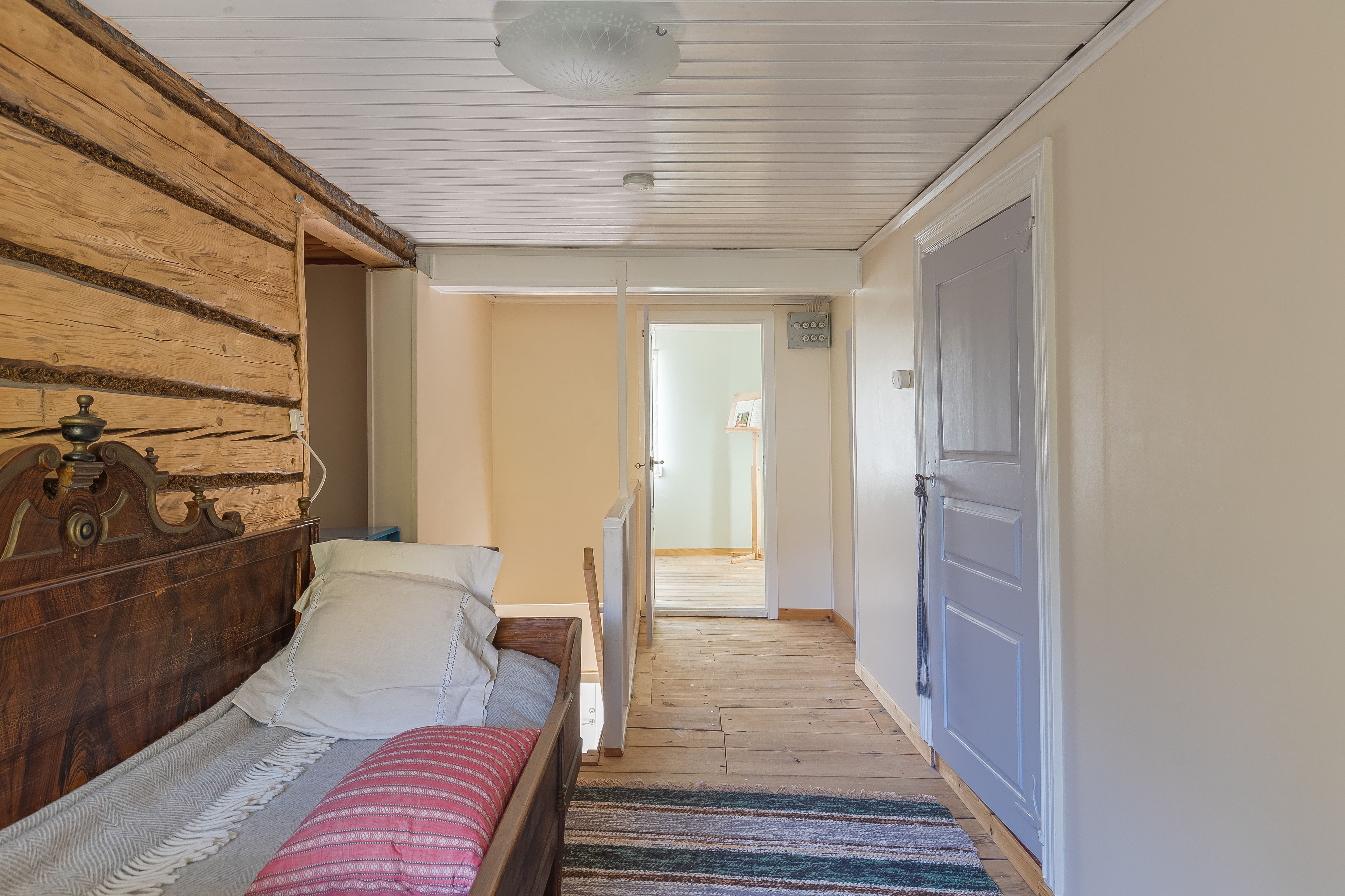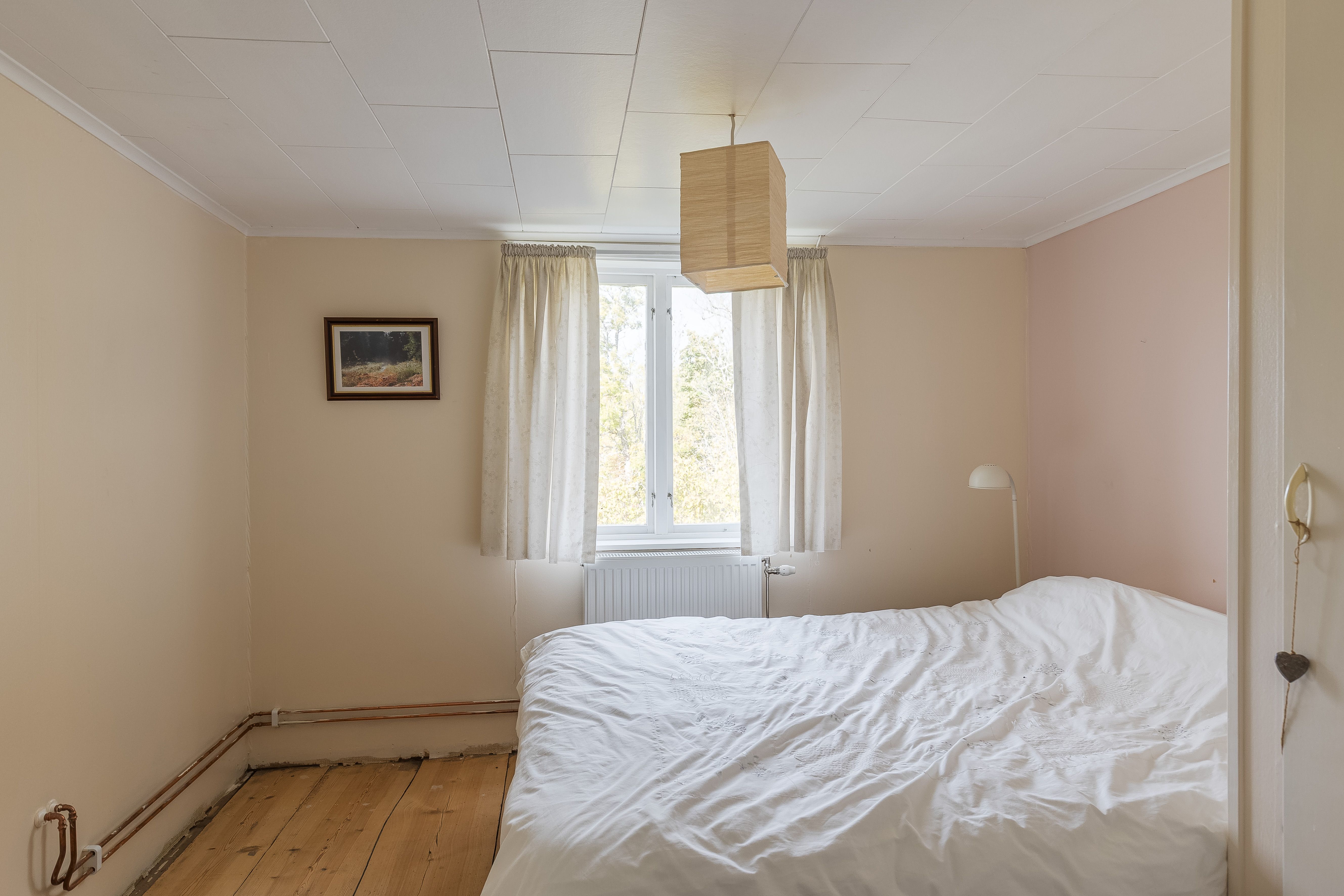 Sovrum 3 är det största av sovrummen. Här finns också vackar äldre golvtiljor och en del av timmerväggen är synlig vilket ger charm och vittnar om svunna tider. Här finns också garderober och synlig skorstensstock (dock ej eldstad).