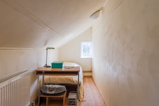 Sovrum 4 är ett mindre sovrum på kattvinden. Utrustat med vackra breda golvtiljor, målad vägg och fönster.