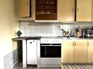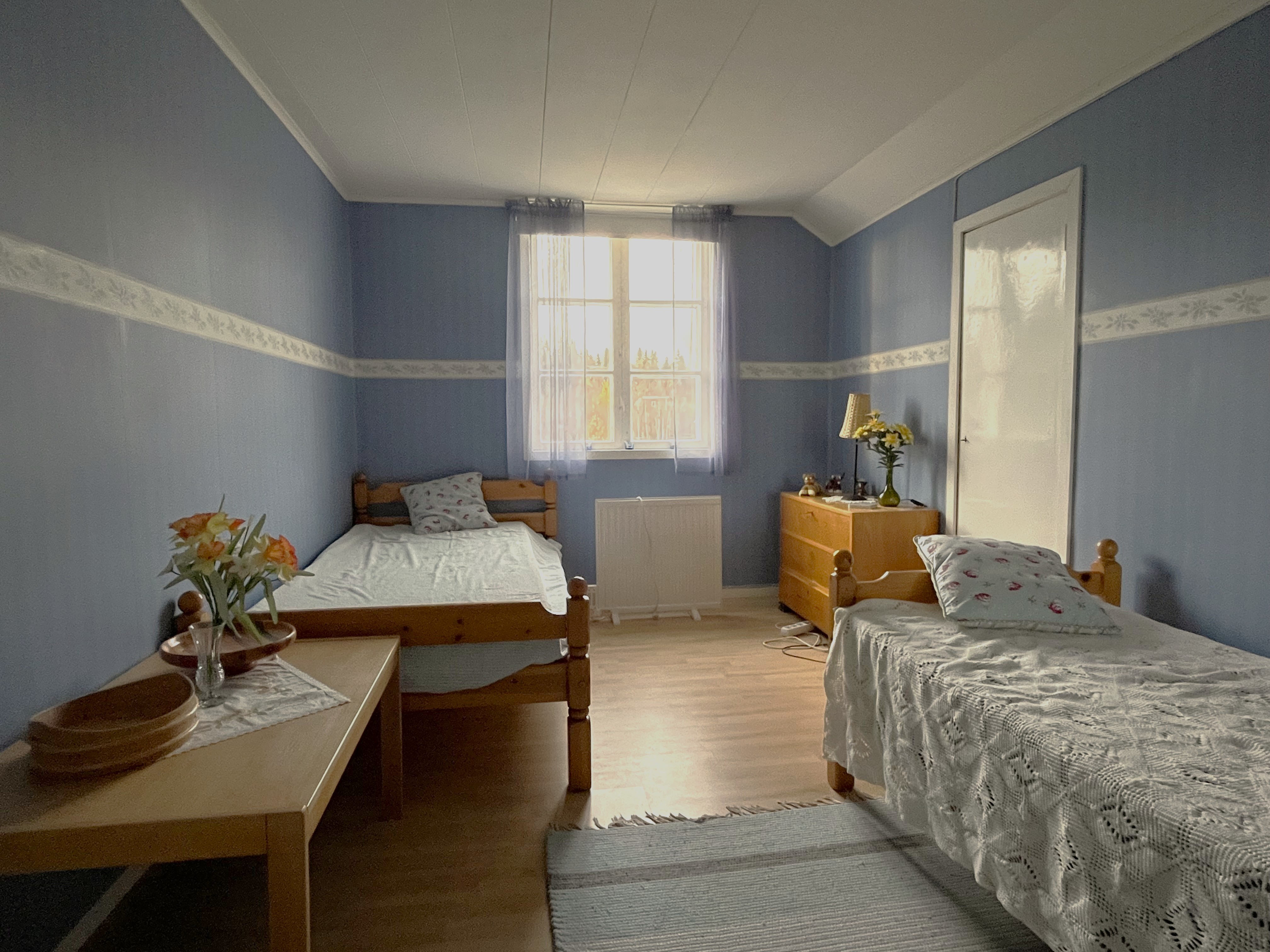 Fint gårdstun med ett väl omhändertaget 40-talshus med trivsam gårdskänsla. Fasaden bär klassisk träpanel under ett äldre pannplåtstak och huset upplevs löpande skött med ljusa ytskikt (främst 90-tal), laminatgolv genomgående och fönster i gott skick—ett fönster på övervåningen bytt 2024. Planlösning med hall, ljust kök med gula luckor, spishäll och kyl med litet frysfack, ett rofyllt sovrum i anslutning till köket samt ett vardagsrum med fint ljus från två väderstreck. Duschrum med vita kaklade väggar och blå våtrumsmatta; här ryms även en smidig toppmatad tvättmaskin. Övervåningen rymmer en liten hall, tre sovrum samt förvaring via kattvindar. Uppvärmning sker via vedeldad Husqvarna köksspis och oljefyllda elradiatorer. Eget vatten och avlopp samt installerat bredband. Sammantaget ett prydligt och välskött hem där 40-talskaraktären lever kvar på ett ombonat sätt.