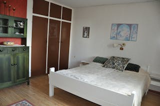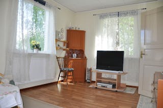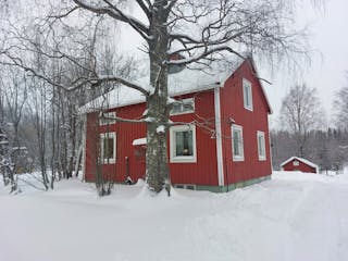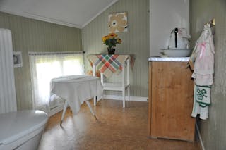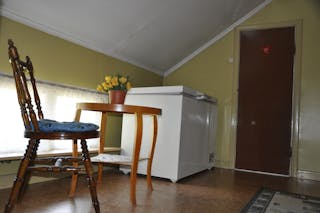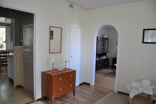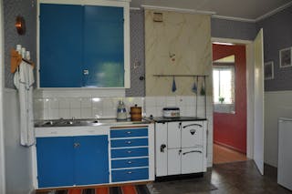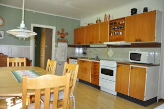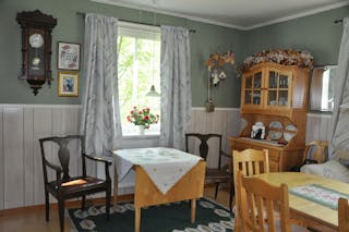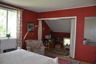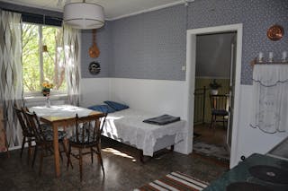 Övervåningen utgörs av en stor hall samt två rum, som likväl kan förvandlas till en egen lägenhet med tanke på att köksinredningen i blå kulör är fint bevarad tillsammans med gjutjärnsspisen som skänker värme och sovalkoverna extra förvaringsutrymme.