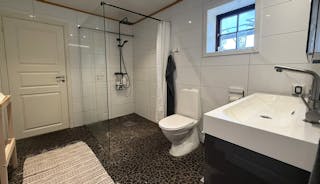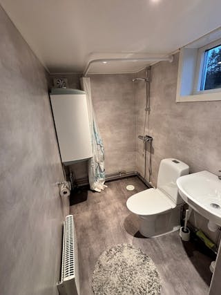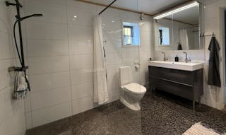 Helkaklat badrum med golvvärme. Inrymmer wc, dusch och handfat.