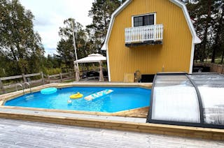 Utanför huset finns ett stort trädäck med både pool och spabad. Läget ger sol hela dagen och bjuder in till en trivsam yta för bad, relax, middagar och umgänge.