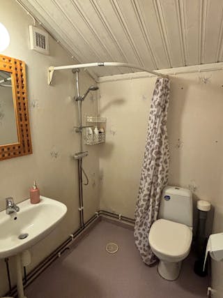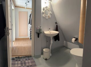 Badrum med våtrumsmatta. Inrymmer WC och handfat.