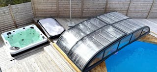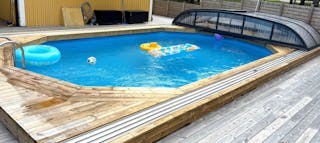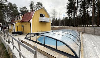 Poolen med måtten 7,40x4,50 m har både värme och pooltak.