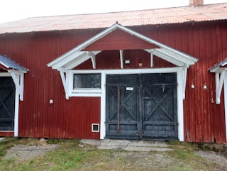 Äldre stallbyggnad uppförd i timmer och trä, på grund av natursten.