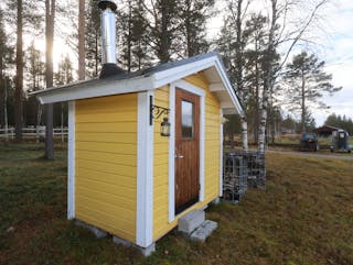 I anslutning till bostadshuset finns en mindre stuga uppförd i trä med tegeltak.
