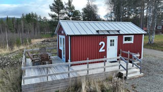 Stuga med altan. Uppförd 2021 i trä, på torpargrund och med plåttak.