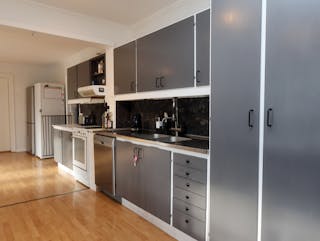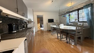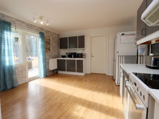 Rymligt kök utrustat med kyl, frys, spis, diskmaskin