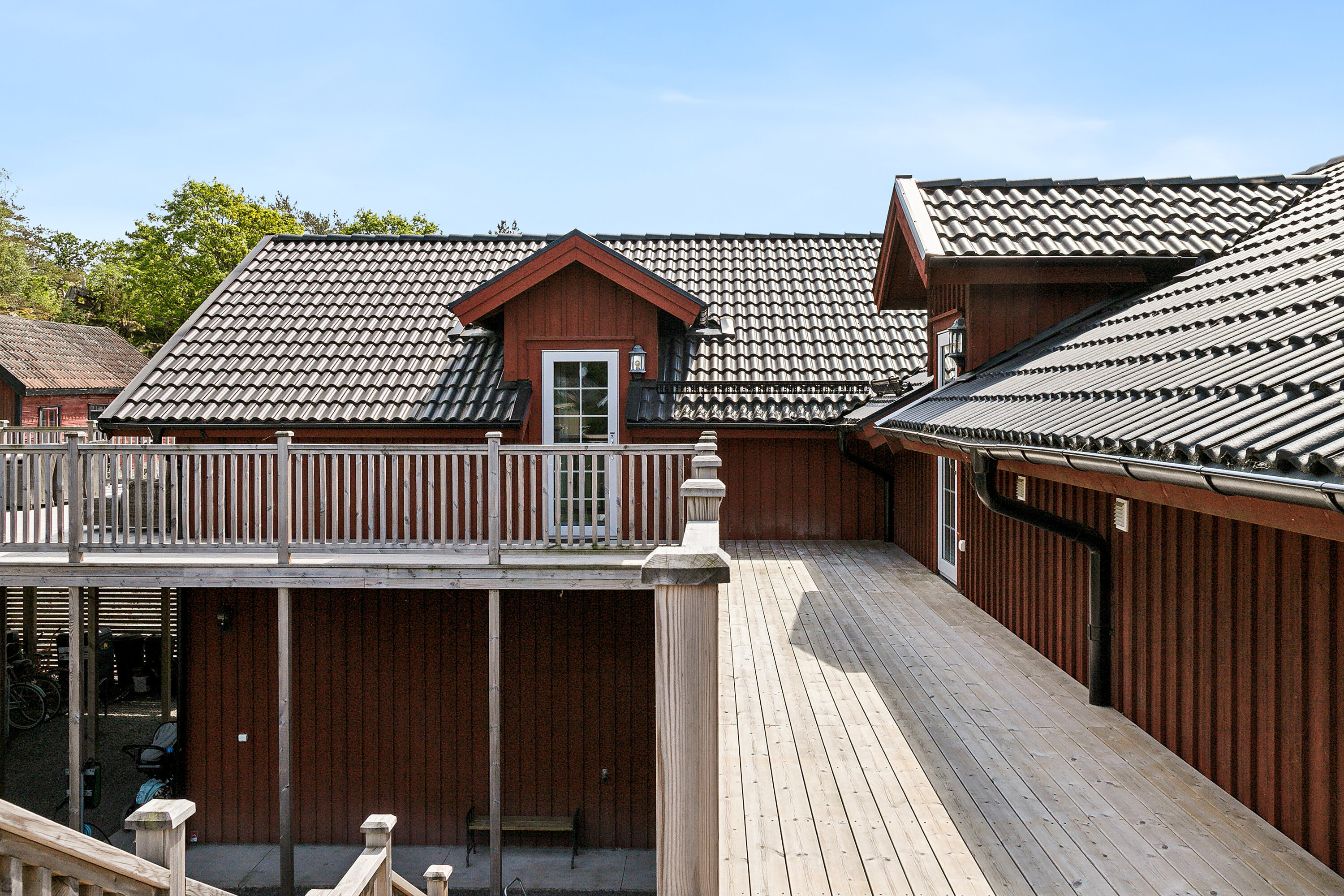Den generösa altanen, uppförd i två etage, erbjuder en härlig utemiljö där den nedre delen fungerar som en skyddad uteplats. Del av ytan är förberedd för installation av pool, vilket ger möjlighet att skapa en exklusiv privat oas.