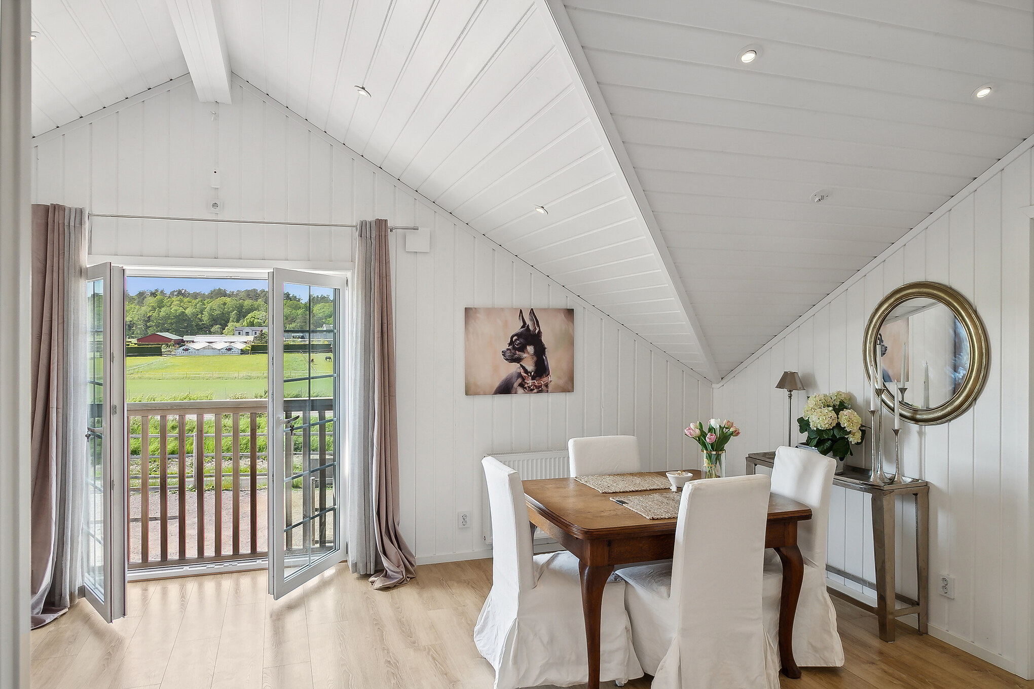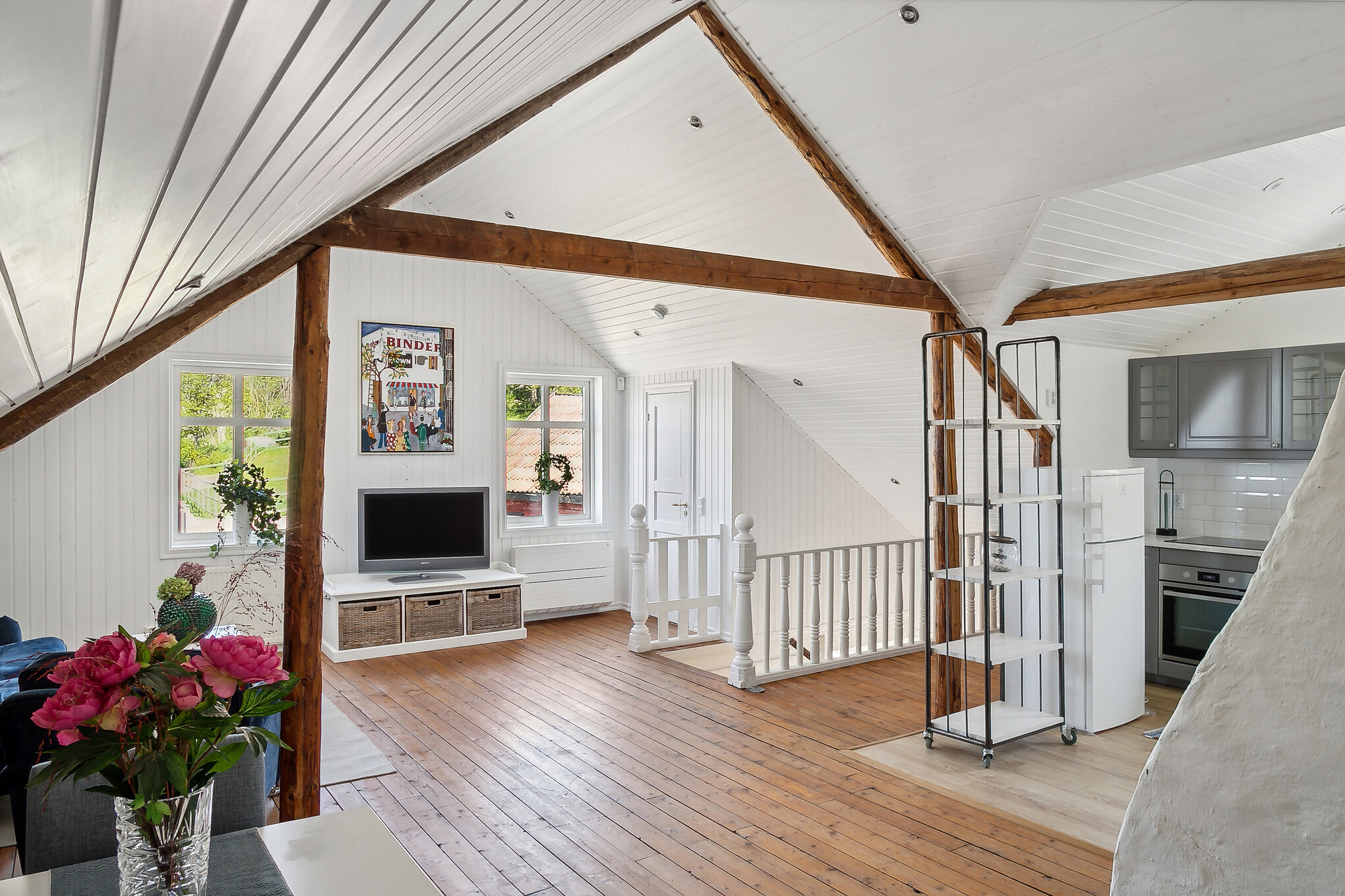 Imponerande allrum med full takhöjd där de vackra, äldre takstolarna har lämnats synliga och ger rummet en unik lantlig karaktär. Vitmålad panel i snedtak och på väggar samt trägolv som förstärker den varma känslan.