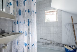 -Badrum med handfat och dusch.