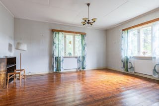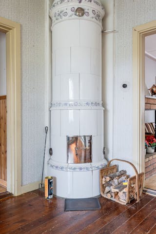 -Vardagsrum med kakelugn och trägolv.