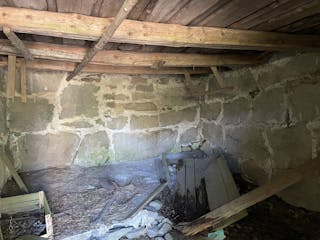 Stensatt jordkällare i renoveringsbehov, belägen norr om ladugården.