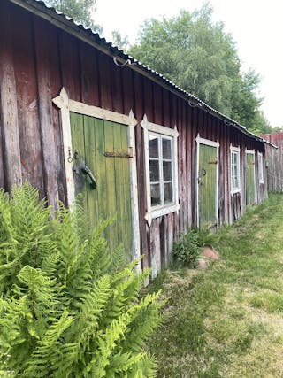 Äldre lågbyggd ekonomibyggnad i trä under yttertak av plåt. Enligt uppmätning på karta är byggnadsytan drygt 100 m².