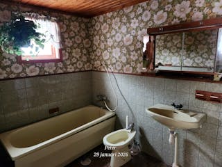 Från gårdsplanen når du entrén med hall och badrum med badkar. Vidare når du ett kök med matplats, vardagsrum, matsal, sovrum samt groventré.