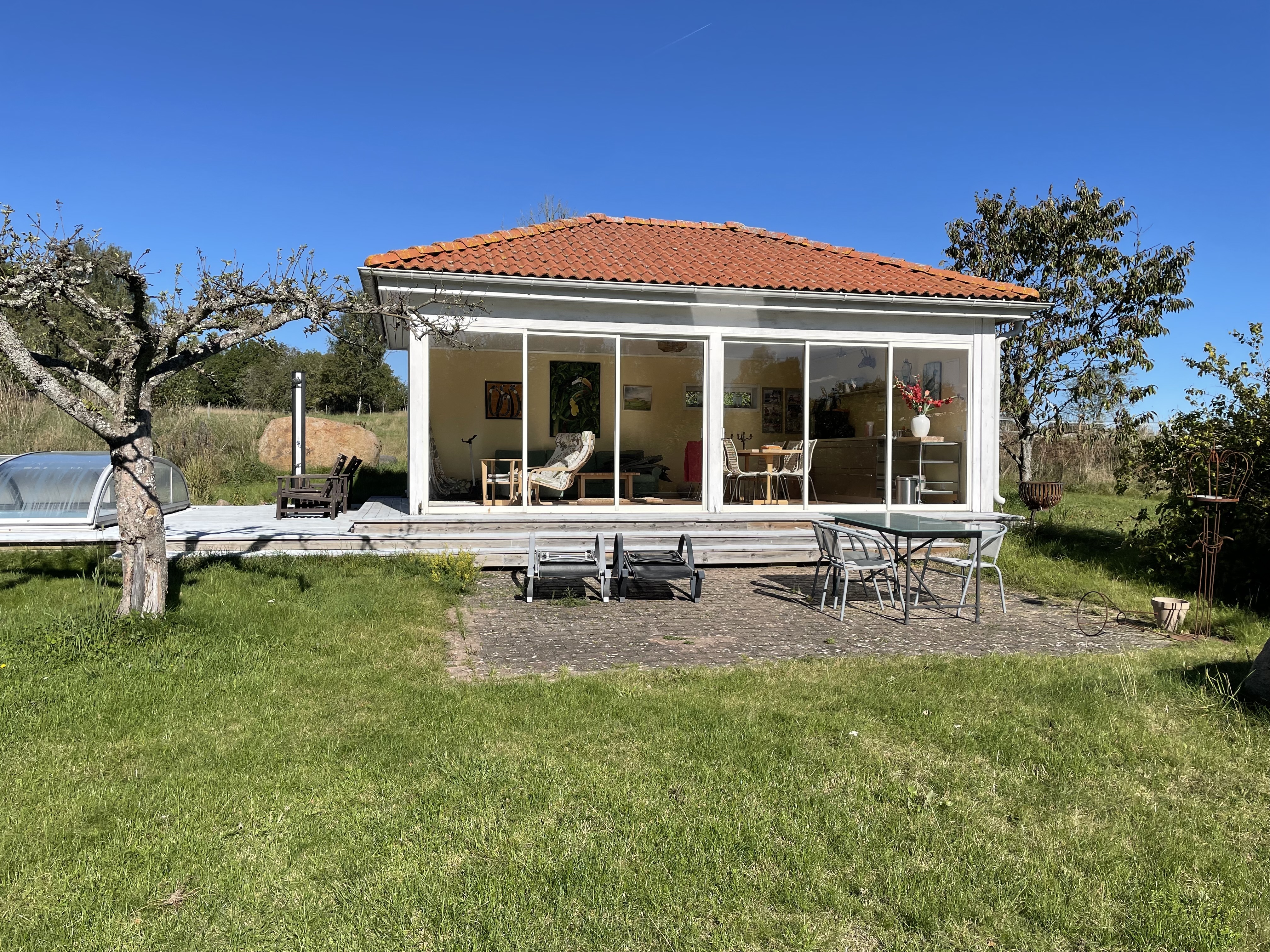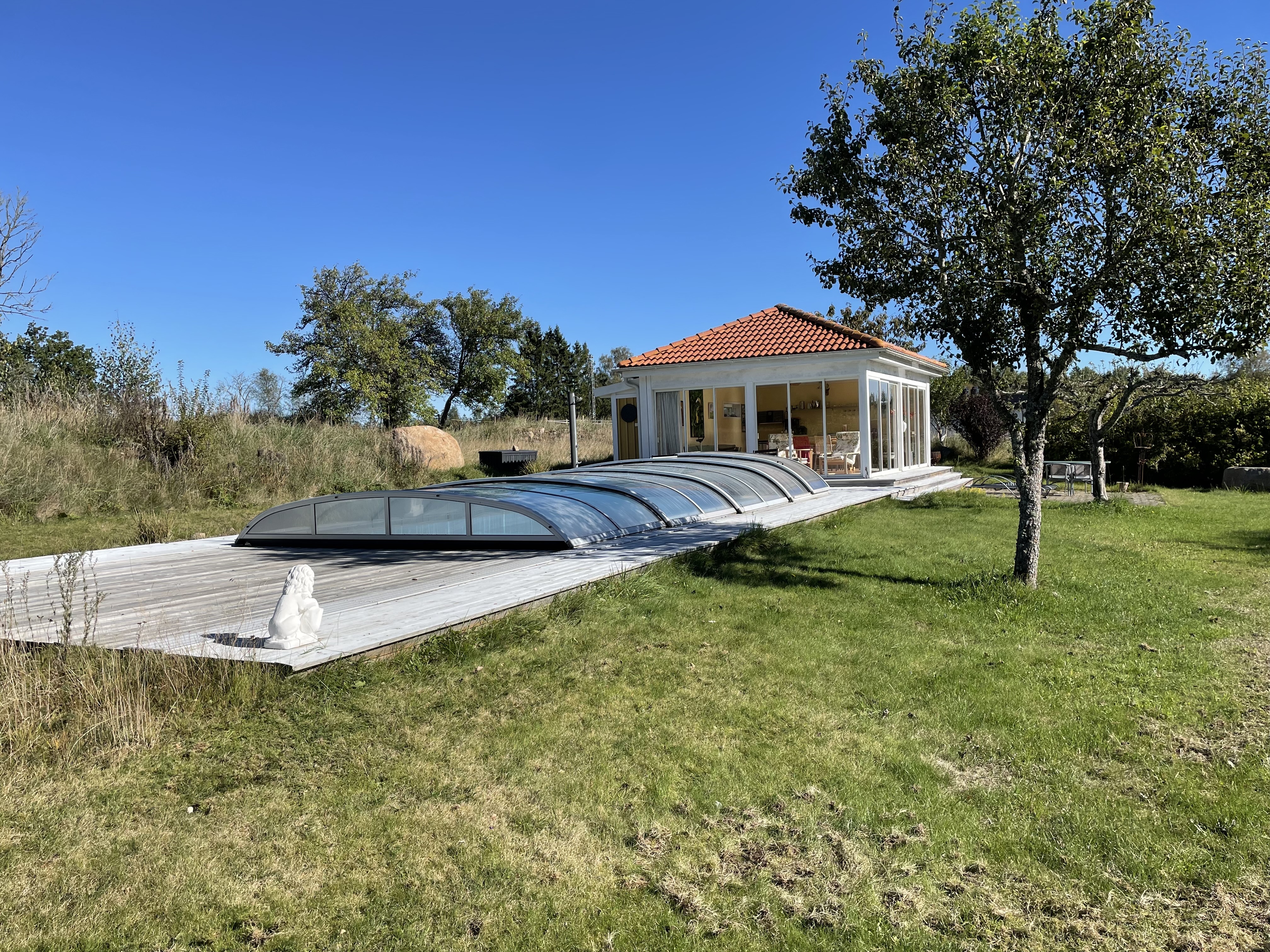 Pampig mangårdsbyggnad med äldre detaljer, samt pool, uterum intill poolen samt garage/maskinhall.