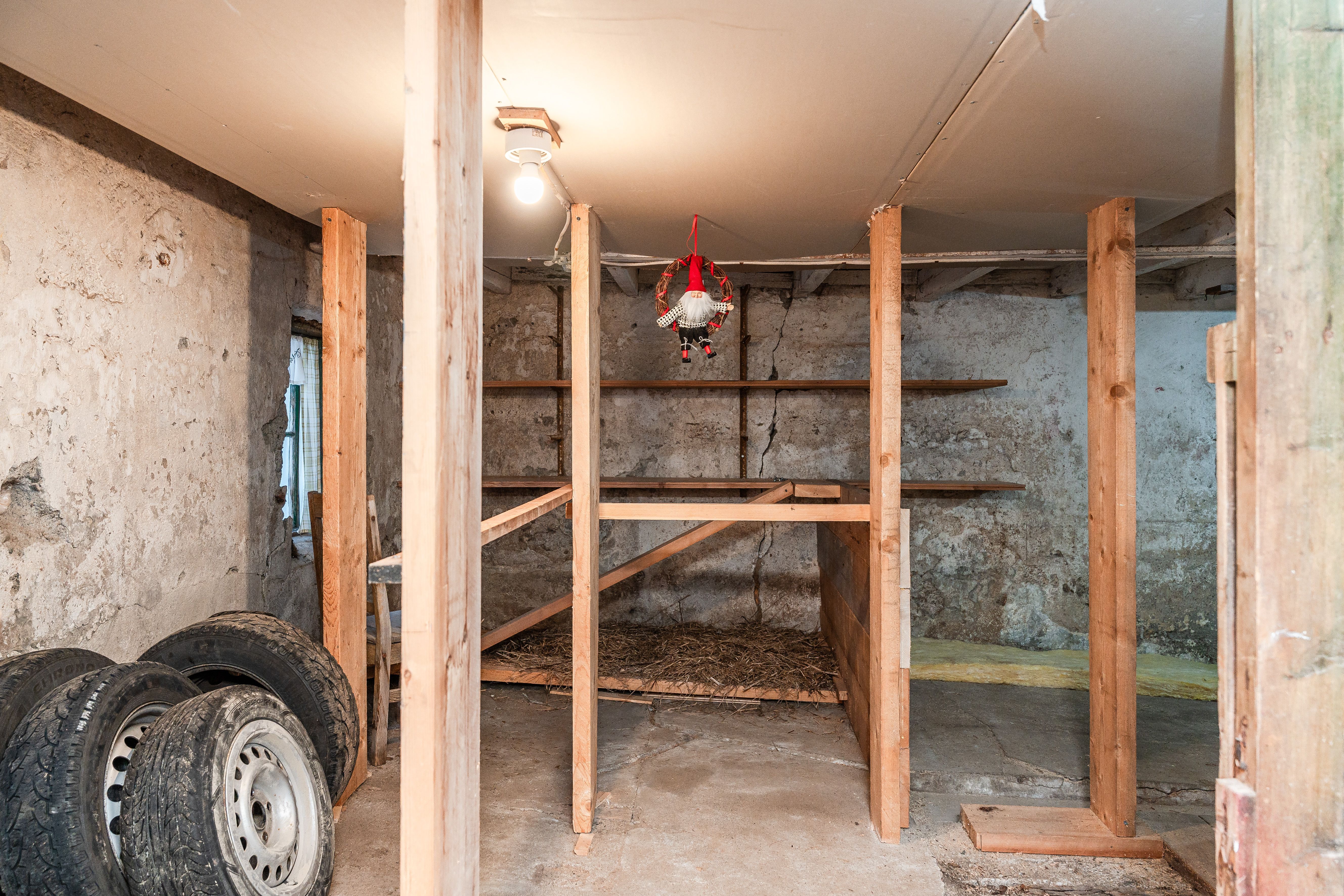 Pannrum med vedeldad panna via radiatorer. Till pannan finns två stycken accumulatortankar på 500 L styck. Intilliggande vedförråd till pannan på ca 10 kvm. Ved intages via lucka. Tvättstuga med tvättmaskin och avlopp. Hobbyrum/förråd med förvaringsmöjligheter. Källarplanen har två ytterligare förrådsdelar, se planlösning. Enskild ingång finns till källarplan.