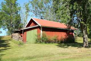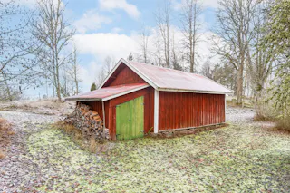 Förrådsbyggnad med plåttak, träfasad och trästomme.