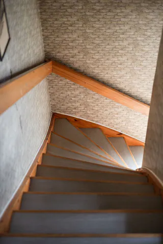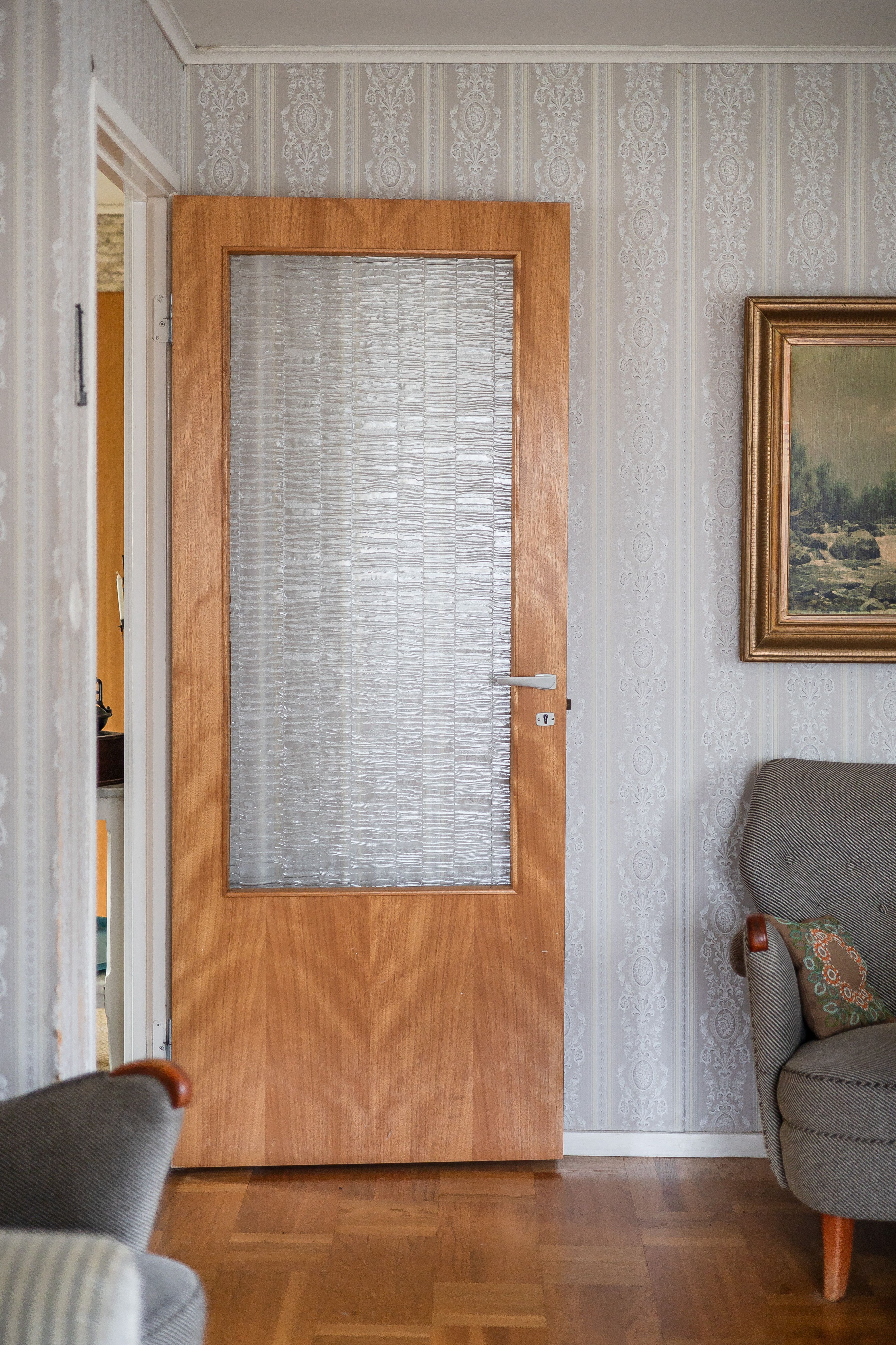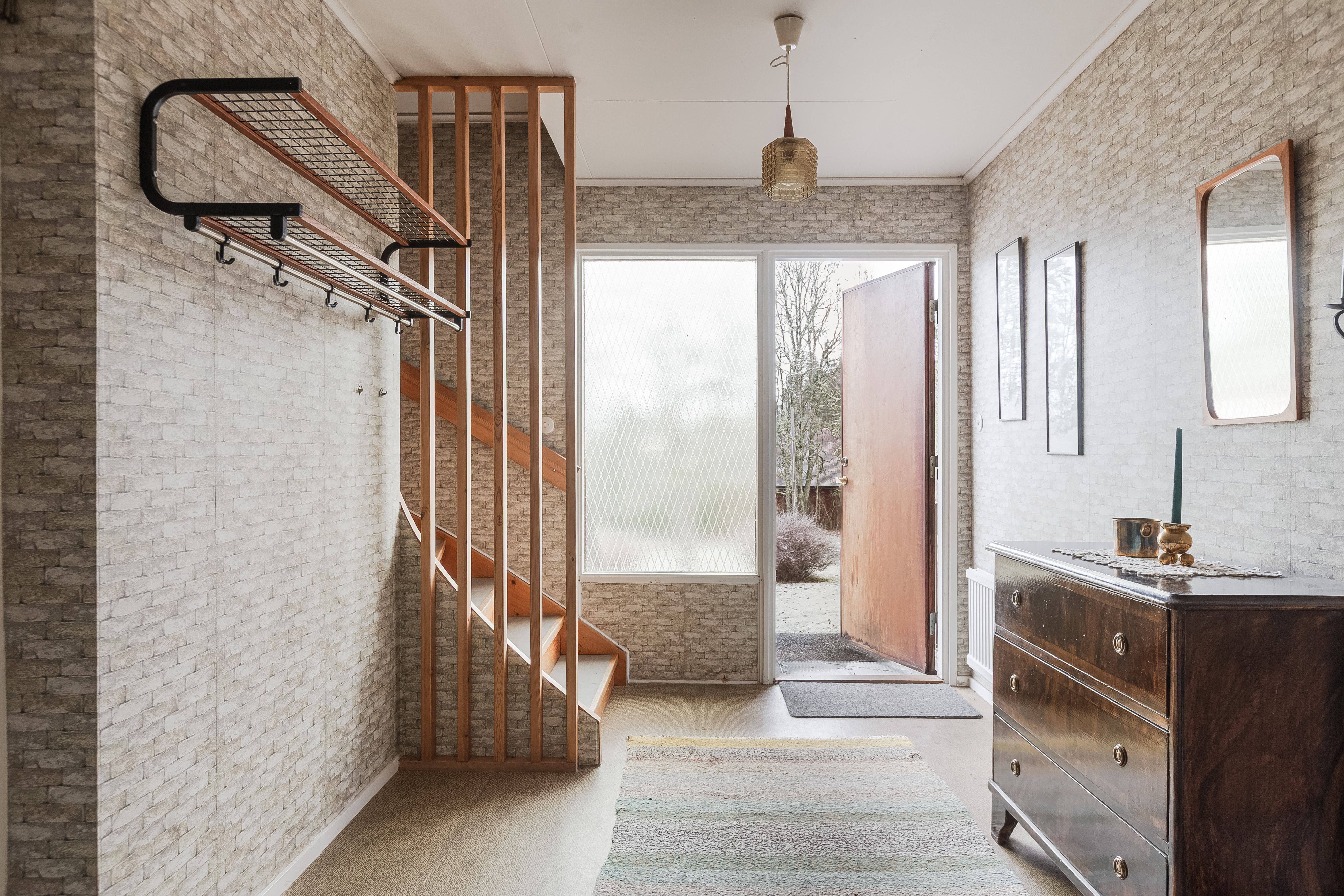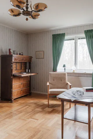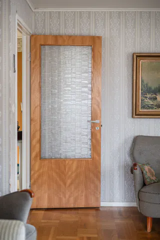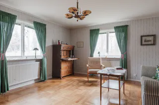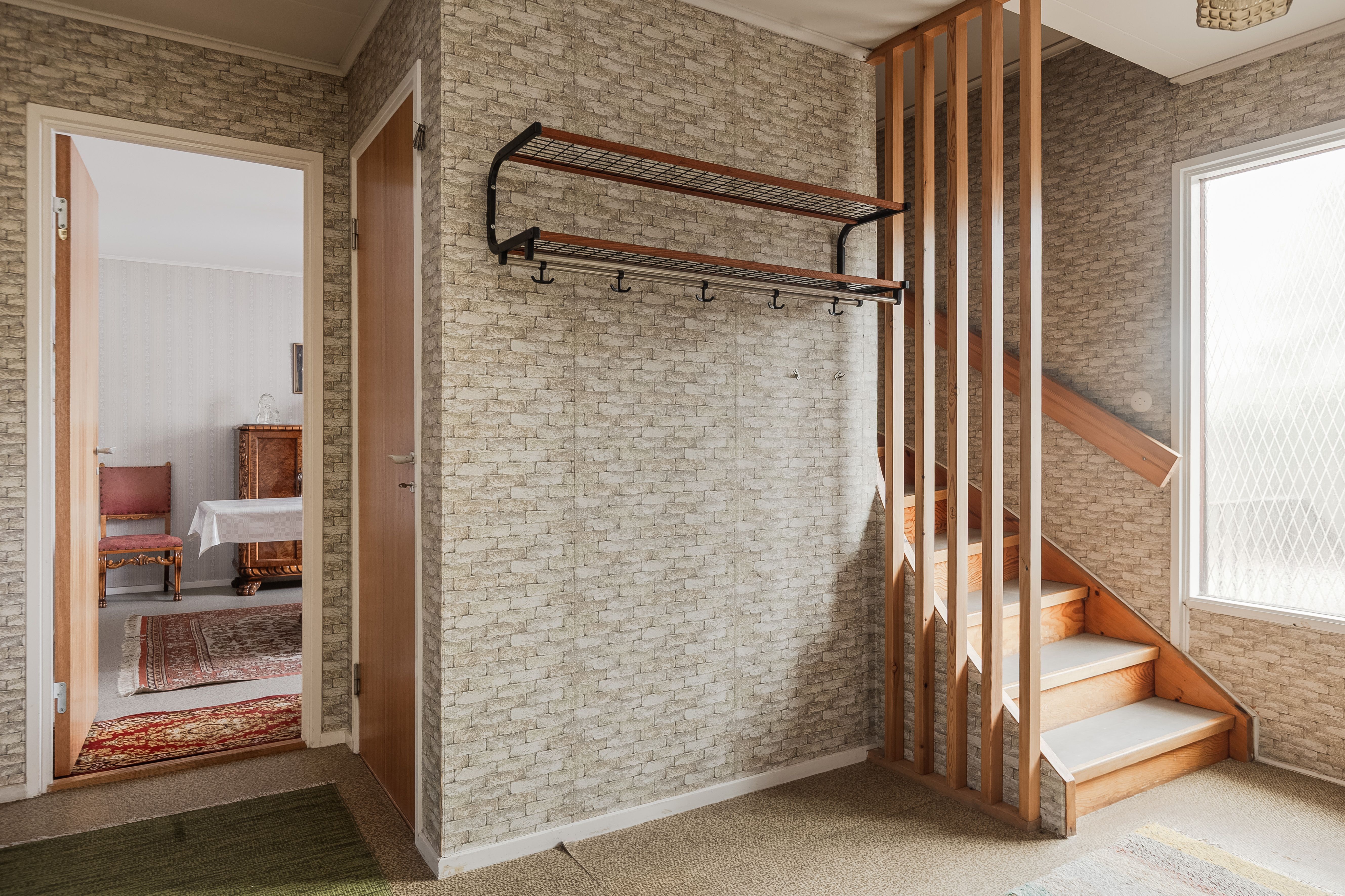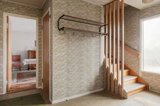 Entré och hall: Du välkomnas in i bostaden av en ljus och rymlig hall med goda avhängningsmöjligheter. Från denna hall tar du dig till entréplanets samtliga rum och köket. I hallen finns även trappan till övre plan och till källarplan. Matta på golvet och mönstrad tapet på väggarna.