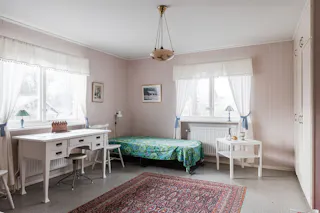 Sovrum: Sovrum med ljusa tapeter och matta på golvet.
