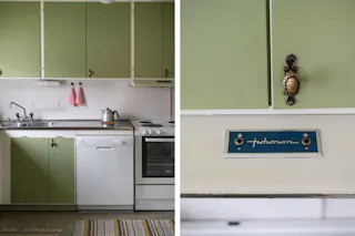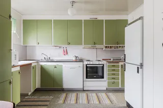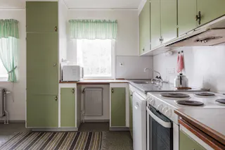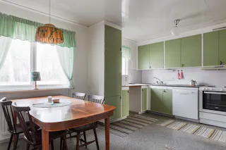 Kök: Lantligt kök utrustat med spis, spisfläkt, diskmaskin samt en kyl/frys. Ljusa skivor som stänkskydd ovan diskbänken och vitmålade väggar. På golvet ligger en matta. Från köket når entréplanets sovrum samt en grovertré.