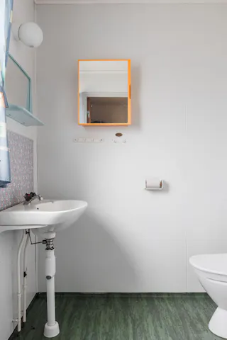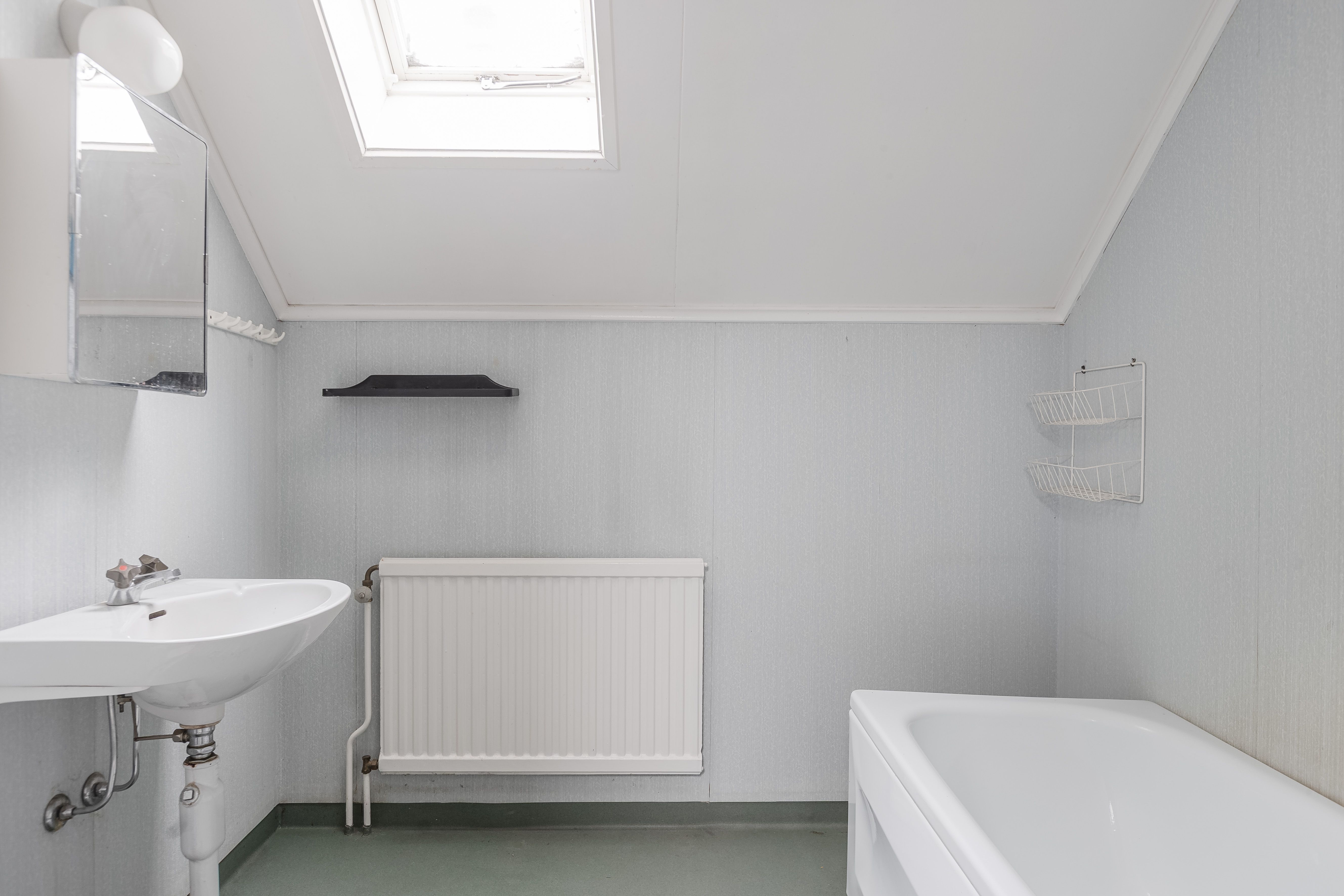 Badrum: Badrum med badkar, handfat, spegelskåp och wc. Badrummet har ljusinsläpp från ett takfönster. Våtrumsmatta på golvet och på väggarna.