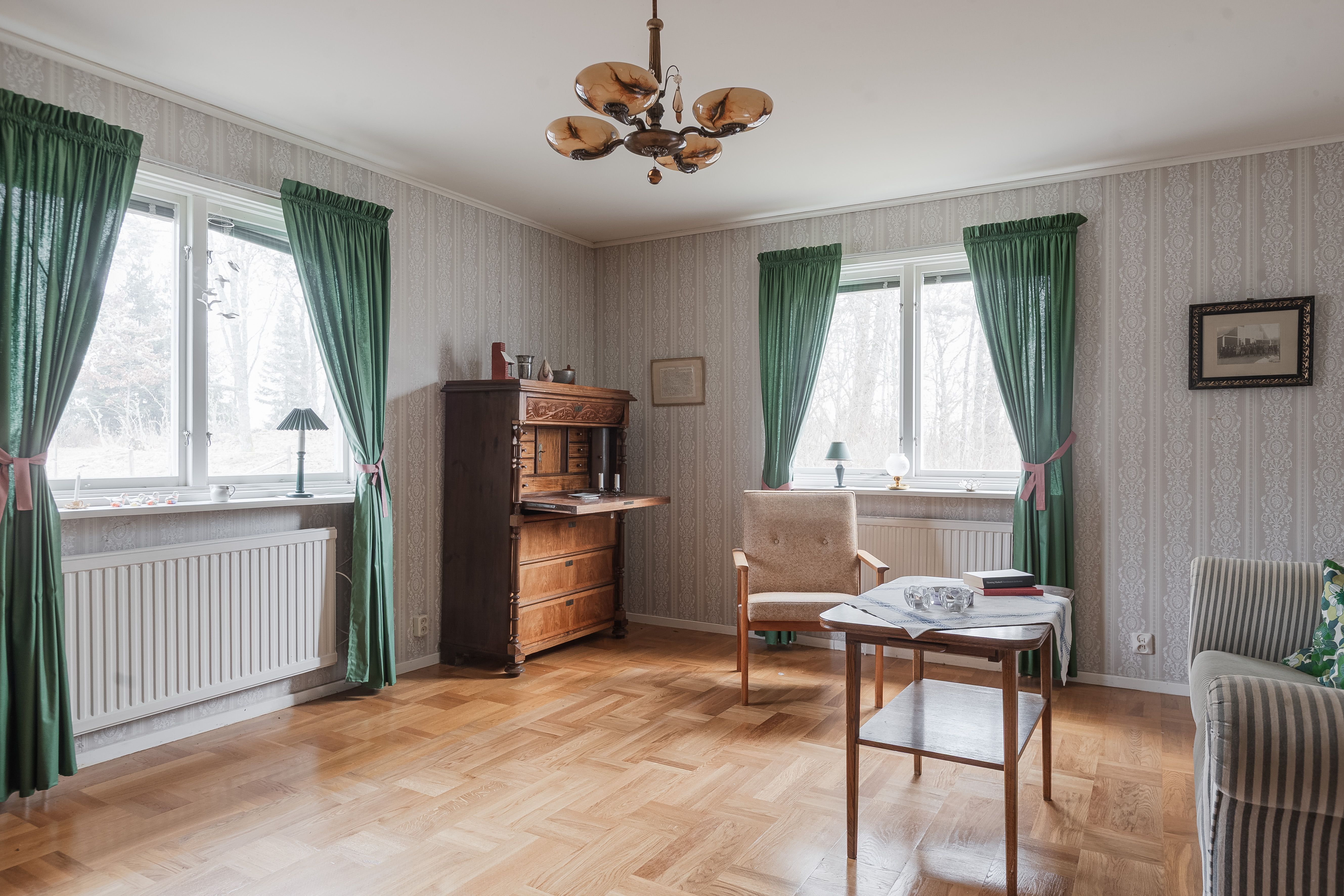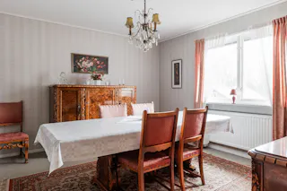 Vardagsrum med matplats: Stort vardagsrum med ljusinsläpp från två väderstreck. Rummet har ljusa mönstrade tapeter på väggarna och parkettgolv.