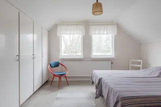 Sovrum: Övre planets största sovrum med ljusa tapeter på väggarna och en matta på golvet. I rummet finns förvaringsmöjligheter i flertalet garderober.