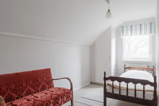 Övre planet består av ett stort rum med snedtak.