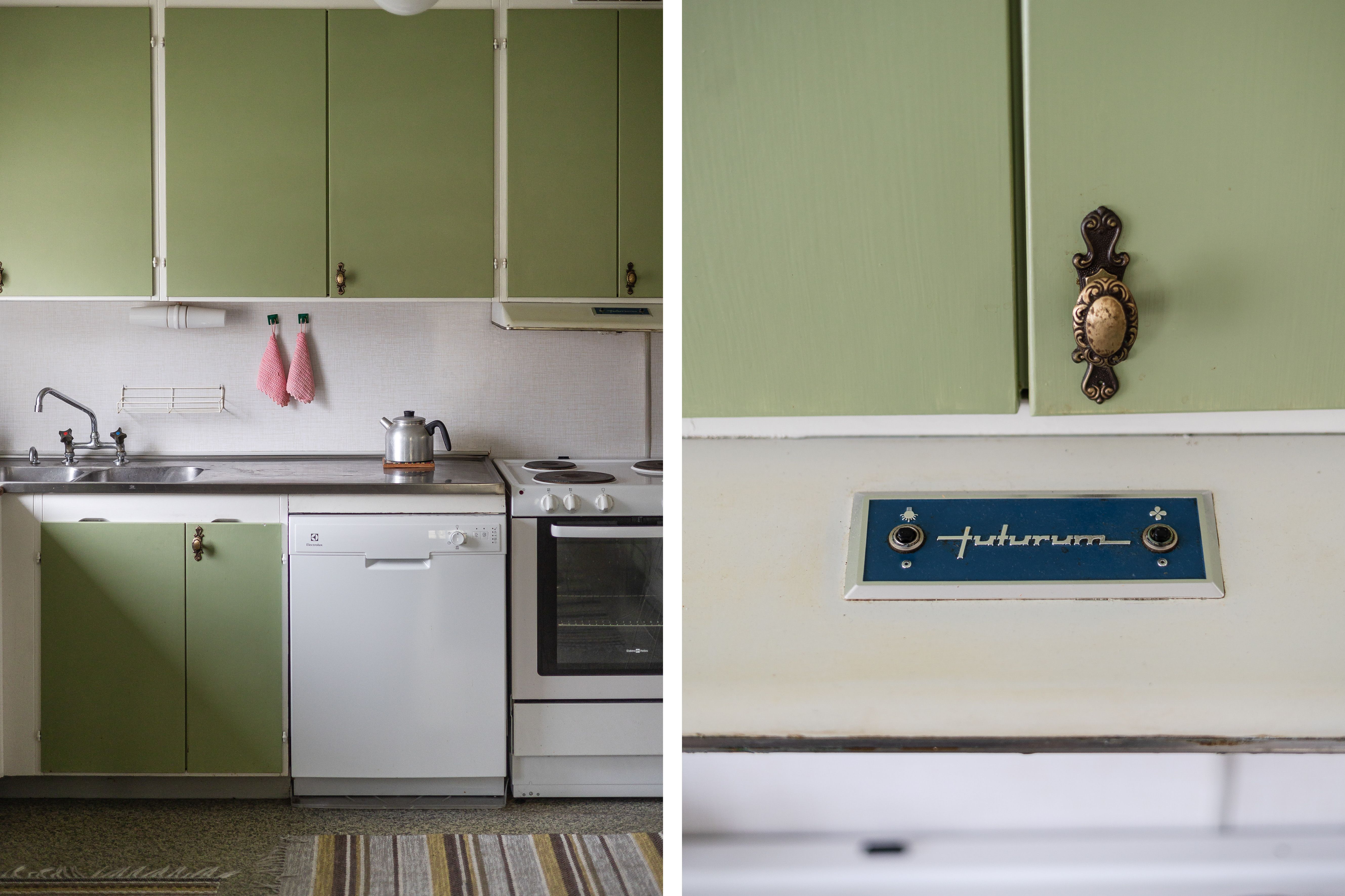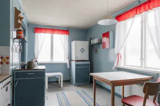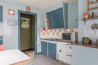 Kök: Litet mysigt kök utrustat med en vedspis, en mindre kyl samt en bänkugn med plattor. Blåmålade väggar och på golvet ligger en matta.