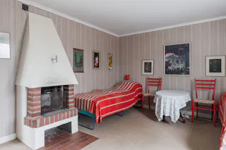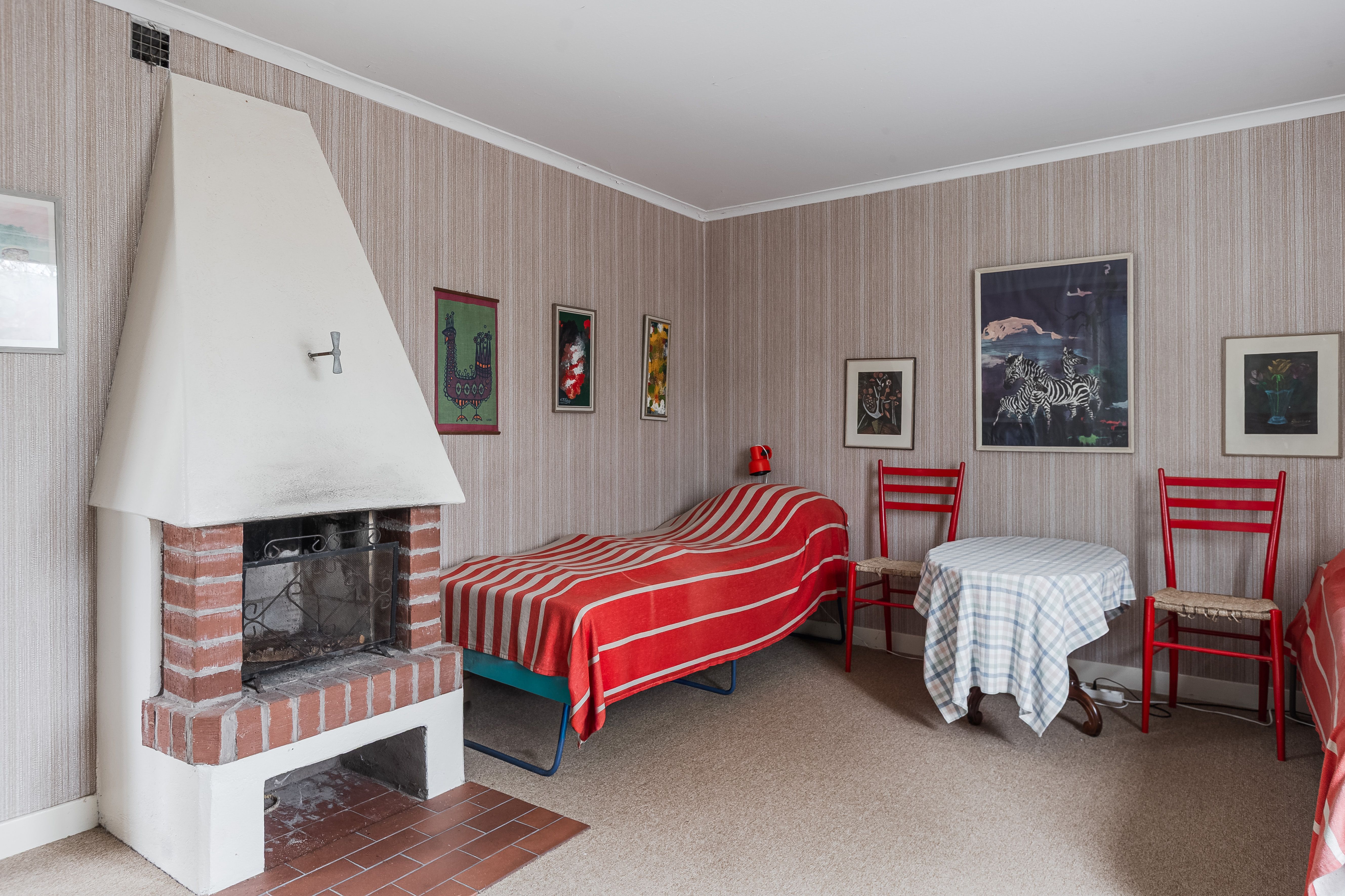 Vardagsrum: Stort vardagsrum med ljusinsläpp från två väderstreck. Rummets centrala punkt är den vackra öppenspisen. Rummet har mönstrade tapeter på väggarna och en matta på golvet.