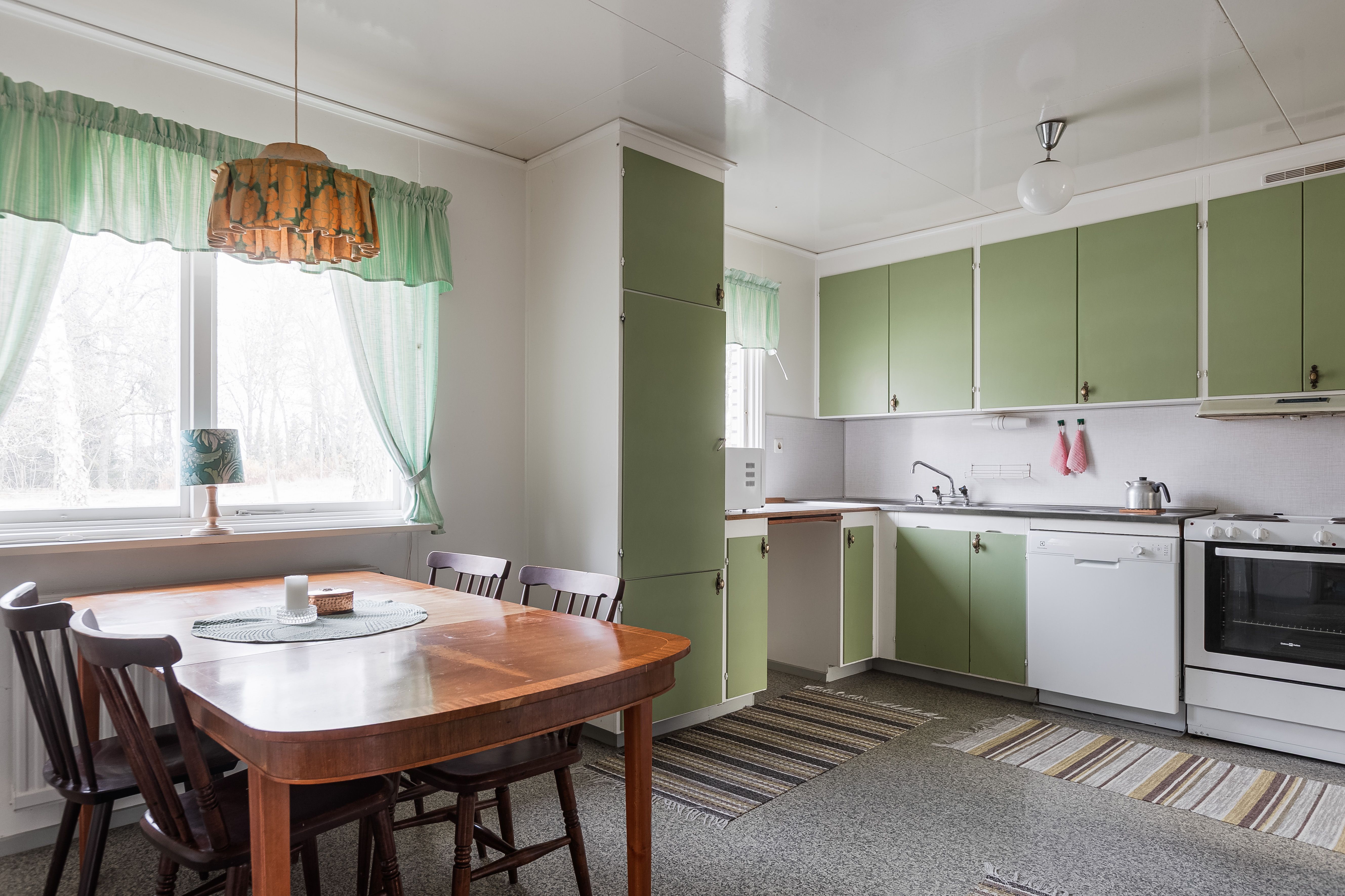 Matsal: Matsal med med matta på golvet och ljusa mönstrade tapeter på väggarna.