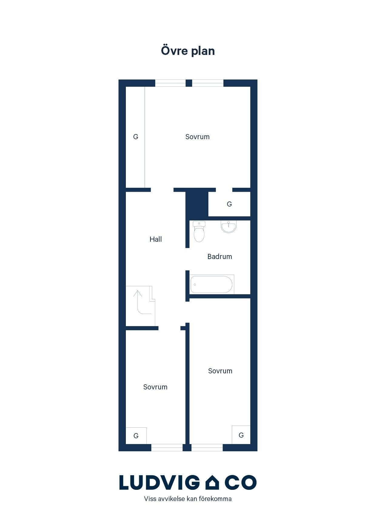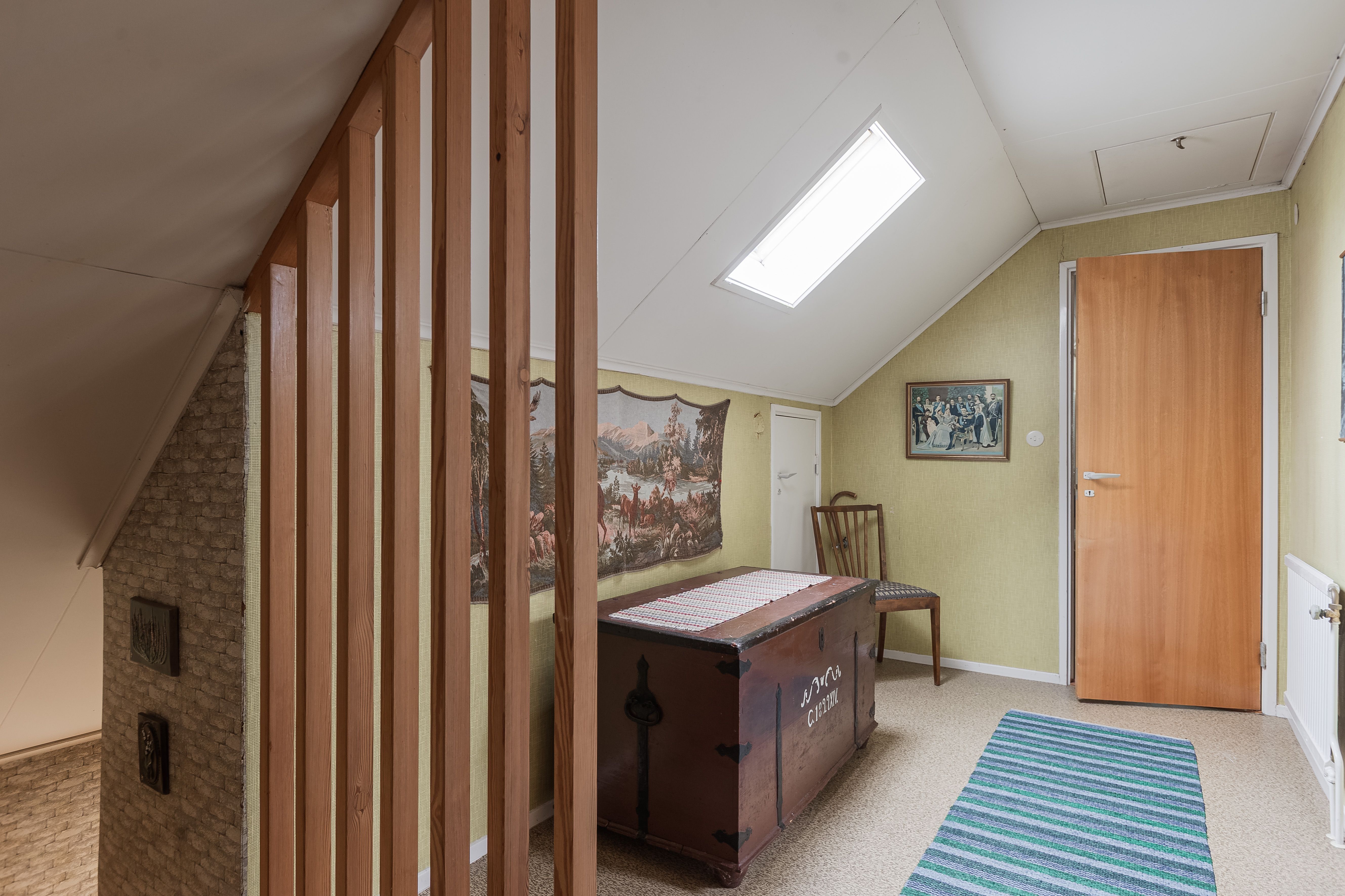 Hall: Hall med ljusinsläpp från ett takfönstrer. Från hallen tar du dig in i övre planets tre sovrum samt till badrummet. Matta på golvet och tapeter i en grön nyans på väggarna.
