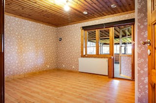 Entréplan inrymmer hall, kök med vedspis, badrum med wc och uttag för dusch, vardagsrum med braskamin i anslutning till köket, kontor samt sovrum med utgång till inglasad veranda, med vedkamin.