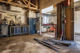 ¤ Verkstad uppförd på gjuten platta med träregelstomme under plåttak, gipsade väggar. El finns indraget. Uppvärmning genom vedpanna. Inrymmer verkstad och garage med plats för två bilar. Slagportar.