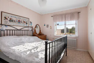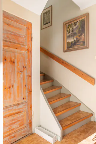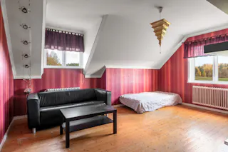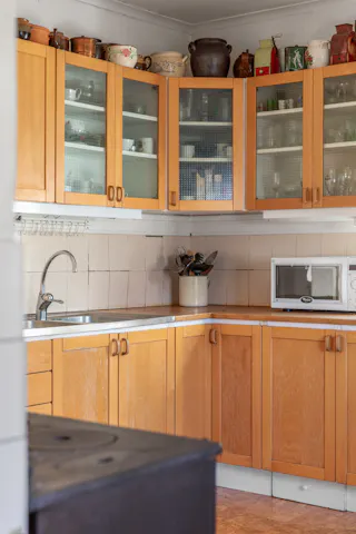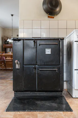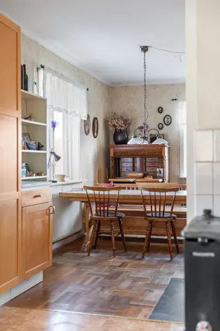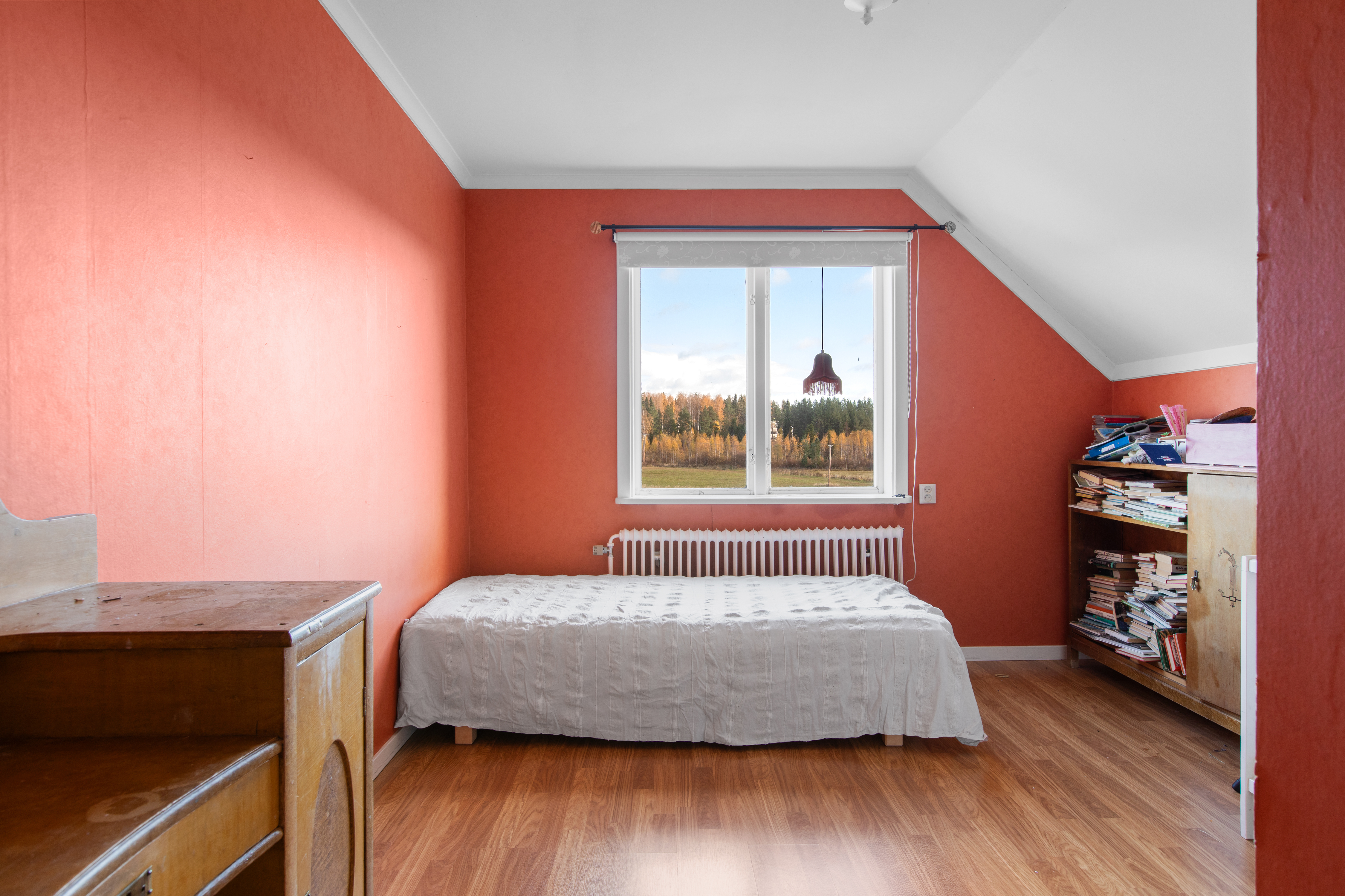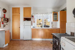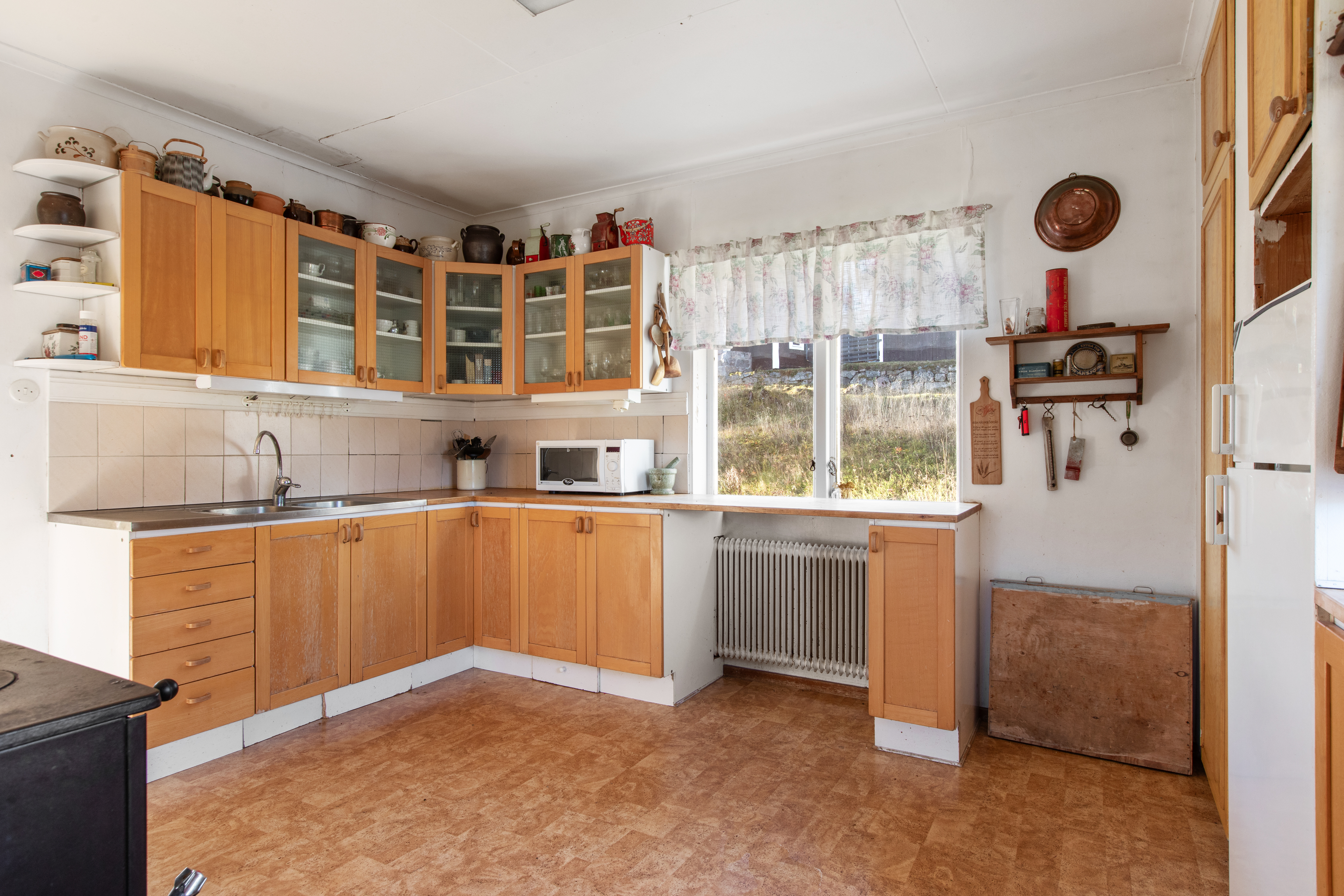 Det rymliga bostadshuset erbjuder gott om utrymme med fyra sovrum, två toaletter och ett trevligt kök med vedspis. Köket är öppet mot vardagsrum/matplats med öppen spis.
