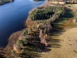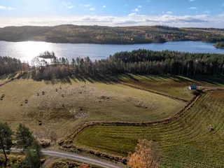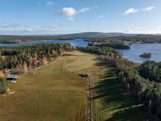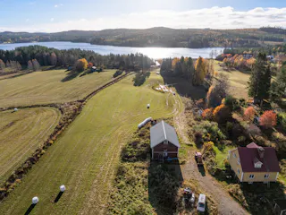 Runt gården breder nästan 10 hektar åkermark ut sig, med marker som sträcker sig hela vägen ner mot Medingen. Här finns plats för både bad och egen båtplats, en sällsynt kombination av jordbruk, skog och vattennära liv.
