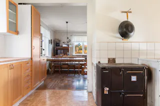 Eldstäder: Vedspis i kök och öppen spis. (Ej besiktad och sotad då ingen bor i huset)